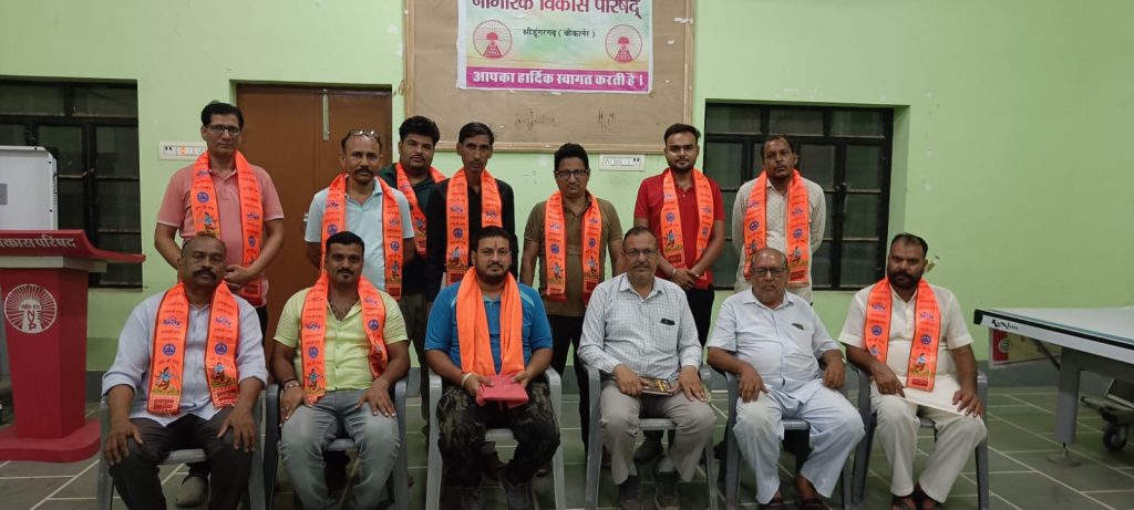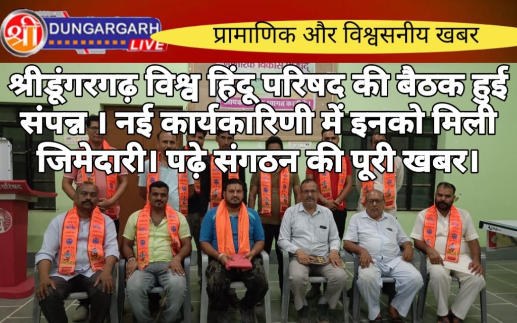 श्रीडूंगरगढ़ आज विश्व हिंदू परिषद प्रखंड व नगर की बैठक रखी जिस में 2024की नई कार्यकारणी की घोषणा हुई जिला अध्यक्ष जगदीश स्वामी ने बताया पिछली साल विश्व हिंदू परिषद ने सनातन के लिए बहुत से कार्य किए ,राम मंदिर प्राण प्रतिष्ठा,राम नवमी,विजय दशमी,कृष्ण जन्मस्थमी,धर्म जागरण ओर भी अनेको कार्यक्रम किए,संरक्षक भंवरलाल दुगड़ ने नई कार्यकारणी की घोषणा निम्न प्रकार की प्रखंड अध्यक्ष श्याम सुंदर जोशी, उपाध्यक्ष अशोक नाई,मंत्री दीपक सेठिया, गौ रक्षा प्रमुख भीखाराम सुथार,सत्संग प्रमुख तिलोक प्रजापत,धर्म जागरण प्रमुख अशोक वैद,प्रसासन प्रमुख फतेसिंह , विश्व हिंदू परिषद नगर की कार्यकारणी में नगर अध्यक्ष लाल सिंह , उपाध्यक्ष पूर्णमल स्वामी,मंत्री मनीष नौलखा, गो रक्षा प्रमुख मुकेश प्रजापत, प्रसासन प्रमुख सुनील पीढ़ीवाल को नियुक्त किया गया बैठक में जिला संयोजक वासुदेव सारस्वत भी शामिल रहे बैठक नागरिक विकास परिषद आडसर बास में संपन्न हुई।