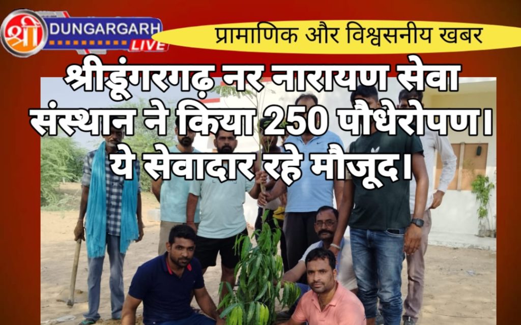 नर नारायण सेवा संस्थान श्री डूंगरगढ़ के संस्थापक धनराज जस्सू ने बताया की प्रकृति को हराभरा और पर्यावरण को स्वच्छ करने के उदेश्य से प्रथमवार संस्थान के सहयोग कर्ताओ के सहयोग से कुल 250 पौधेरोपण किये गए , स्थान रहे बीदासर रोड बीएसएनएल टावर के पास,सेवाधाम प्रांगण, गुसाईसर गौशाला, काली मंदिर बिग्गा बास, करणी माता मंदिर प्रताप बस्ती, रेल्वे स्टेशन के आस पास और कुछ पौधे आमनागरिको के घर पर पौधे रोपण किये गए, खुले स्थान पर जितने पौधे रोपण किये गए उन पौधों को लोहे की जाली से घेराव किया गया है ताकी कोई भी पशु नुकसान ना कर सके, इस पौधारोपण आयोजन मे सेवादार रहे आनंद जोशी,नंद किशोर नाई, संदीप कायल, श्याम व्यास, गणेश शेखावत, श्याम गिरी, राजू स्वामी, इंद्रसिंह राजपुरोहित और मोमासर बास मित्र मंडली के सदस्य..