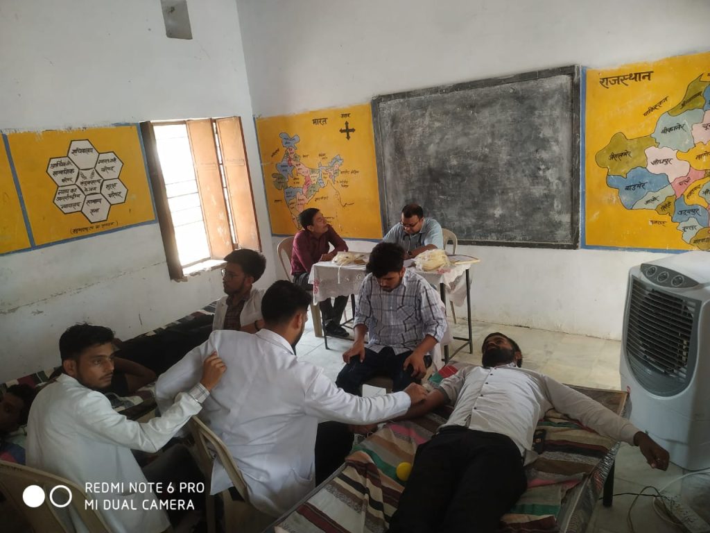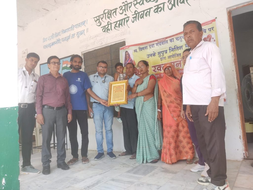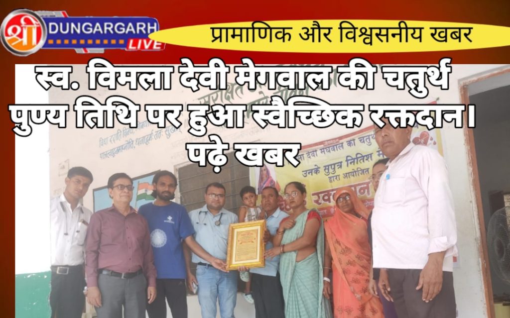 गांव धीरदेशर पुरोहितान में स्व. विमला देवी मेघवाल की चतुर्थ पुण्यतीथी पर उनके सुपुत्र नीतीश मेहरा द्वारा रक्त दान शीविर का आयोजन किया गया,राजकीय प्रवेशिका संस्कृत विद्यालय में आयोजित हुआ।रक्त दान शिवर आज सुबह 9 बजे से 2 बजे तक रखा गया था जिसमे सभी लोगो ने स्वैच्छिक रूप से रक्त दान दिया । जिसमे 42 युनिट रक्त संग्रहण हुआ PBM होस्पिटल टीम ने रक्त संग्रहण किया कार्यक्रम में ओमप्रकाश मेहरा, रामलाल मेहरा प्राधानाचार्य, राकेश अशोक, रेखा, सुमन, अन्य ग्रामीण उपस्थित रहे ।