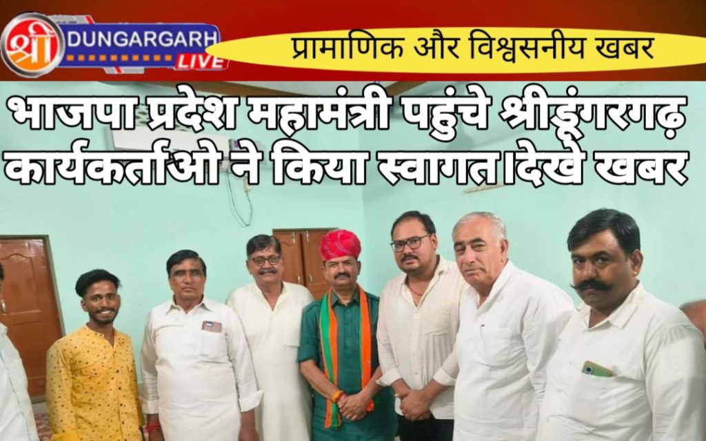 भाजपा प्रदेश महामंत्री सरवन सिंह बगड़ी श्रीडूंगरगढ़ पधारने पर पूर्व प्रधान छैलू सिंह शेखावत के नेतृत्व में सिंधी भवन में महामंत्री सरवन सिंह बगड़ी का कार्यकर्ताओं द्वारा स्वागत किया गया साथ में उपस्थित विश्वकर्मा कौशल विकास बोर्ड के अध्यक्ष राज्य मंत्री रामगोपाल सुथार, श्रीडूंगरगढ़ नगर पालिका के अध्यक्ष मानमल शर्मा ,पूर्व अध्यक्ष भाजपा नेता रामेश्वर पारीक ,अल्पसंख्यक मोर्चा के जिला अध्यक्ष इमरान राईन ,आडसर सरपंच प्रतिनिधि शिवप्रसाद जोशी, रणवीर सिंह सेरुन्ना ,गजानंद बोहरा,गिरधारी जोशी, भागीरथ सिंह झेंझऊ, रतनसिंह केऊ, फूसनाथ सिद्ध, पार्षद गोपाल छापोला, भरत सुथार ,अरुण पारीक, श्याम पुरोहित, शिवप्रसाद तावनिया, नवरत्न राजपुरोहित तोलियासर, प्रतापसिंह लखासर, बाबूलाल शर्मा, राजू शर्मा,सरवन सिंह,जगमाल सिंह ,कालू सिंह, सरवन नाई मोमासर, विक्रम शेखावत, महेंद्र राजपूत, विक्रमसिंह सत्तासर, समुंदरसिंह धीरदेसर चोटियान,जगमाल सिंह कितासर, जेठूसिंह पुंदलसर, रामलाल सुथार,चंदू नाई, नंदू नाई, समुंदरसिंह लखासर, ओमपाल सिंह जोधासर, किशन नाई, द्वारका प्रसाद सेन, अशोक सिंधी,आनंद जोशी, रामदास स्वामी आडसर, मांगीलाल , किशन पूरी, नंदकिशोर नाई, टोनी शेखावत सुधीरसिंह शेखावत,गोपी मेघवाल तमाम भारतीय जनता पार्टी के कार्यकर्ताओं ने गर्मजोशी से प्रदेश महामंत्री जी का स्वागत किया