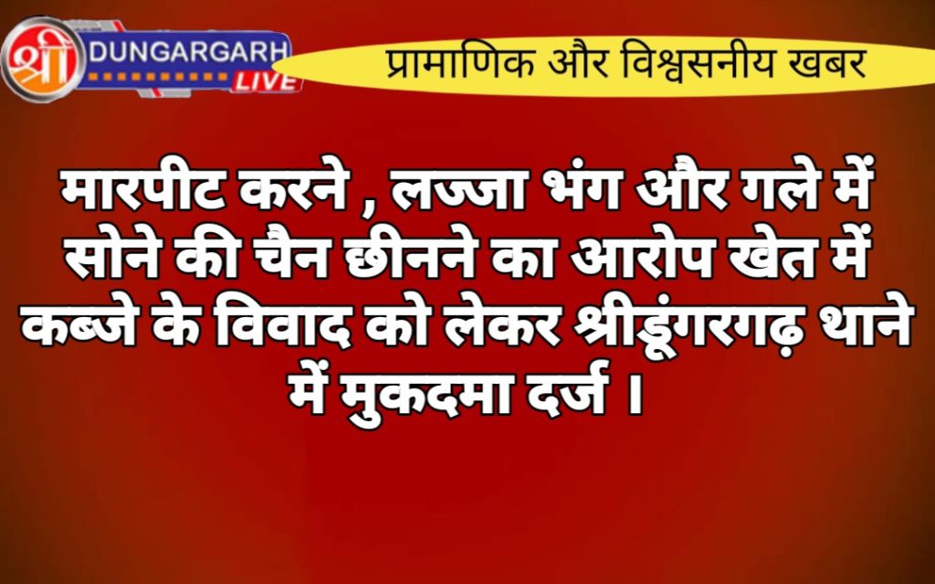 श्रीडूंगरगढ़ थाने में मुकदमा दर्ज करवाते हुवे शैतानसिंह पुत्र भूराराम सोनी ग्राम तोलियासर ने अपने ही गांव के आरोपी सीताराम व राजूराम पुत्र पोकरराम पुरोहित व सीताराम बेटे मूलचंद व मघाराम और थानाराम पुत्र भंवराराम पुरोहित के खिलाफ मामला दर्ज करवाया है। परिवादी ने पुलिस को बताया कि गुरूवार सुबह करीब 7.30 बजे अपनी पत्नी सुशीला के नाम खोतदारी खेत में गए। तभी परिवादी के खेत के उत्तरी दिशा में स्थित खेत के आरोपीगण हाथों में चौसांगी, कुल्हाड़ी व लाठियां लेकर आए व उसके खेत में बनी झोपड़ी खुर्द बुर्द कर दी। आरोपियों ने गालियां देते हुए खेत छोड़कर भाग जाने की धमकी देते हुए परिवादी पर हमला कर दिया। परिवादी के सीर से खून बहने लगा तो आरोपियों ने उसे जमीन पर गिरा दिया। उसकी पत्नी सुशीला देवी बीच बचाव करने लगी तो आरोपियों ने उसकी लज्जा भंग करते हुए गले में पहनी सोने की चैन छीन ली। पड़ौस के खेत में रहने वाले काश्तकार ने परिवादी के घर सूचना दी तो उसका पुत्र नवीन और रेवंतराम पुत्र मालाराम मौके पर पहुंचे। आरोपियों ने नवीन के साथ भी मारपीट की। परिवादी ने बताया कि आरोपी सीताराम ने इससे पूर्व में भी उसके खेत पर कब्जा करने का प्रयास किया जिसकी परिवाद भी थाने में दी गई। श्रीडूंगरगढ़ थाने में मुकदमा दर्ज कर लिया है और आगे की जांच एसआई हेतराम को सौंप दी है