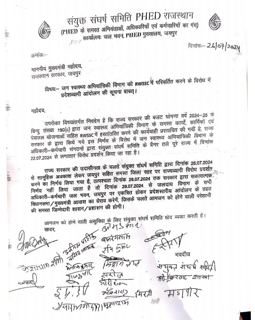 जलदाय विभाग के कार्यों को आरडब्ल्यूएसएससी को हस्तांरित करने का विरोध मुखर होने लगा है। संयुक्त संघर्ष समिति PHED राजस्थान के बैनर तले आज श्रीडूंगरगढ़ शाखा के जलदाय विभाग के कार्मिकों ने उपखण्ड अधिकारी श्रीमती उमा मित्तल को मुख्यमंत्री के नाम ज्ञापन सौंपा। समिति के सदस्यों ने बताया कि राज्य सरकार की बजट घोषणा वर्ष 2024-25 के बिंदु संख्या 190 (i) द्वारा जन स्वास्थ्य अभियांत्रिकी विभाग के समस्त कार्यों, कार्मिकों एवं पेयजल योजनाओं सहित RWSSC में हस्तांतरित करने की कार्यवाही प्रस्तावित की गयी है। राज्य सरकार के द्वारा किये गये इस निर्णय के विरोध में जन स्वास्थ्य अभियांत्रिकी विभाग के अधिकारी-कर्मचारी संगठनों द्वारा संयुक्त संघर्ष समिति के बैनर तले पूरे राज्य में दिनांक 22.07.2024 से लगातार विरोध प्रदर्शन किया जा रहा है। समिति द्वारा आज 26 जुलाई को सामुहिक अवकाश लेकर संयुक्त संघर्ष समिति द्वारा जयपुर सहित समस्त जिला स्तर पर राज्यव्यापी विरोध प्रदर्शन करने का निर्णय लिया गया है। विभाग के कार्मिक राजकुमार तावणियाँ ने बताया कि अगर सरकार द्वारा 28 जुलाई तक कोई सकारात्मक कदम नही उठाया जाता है तो समिति के बैनर तले 29 जुलाई को प्रदेश स्तरीय आंदोलन किया जाएगा। कार्मिक मनोज कुमार नाई ने बताया कि आरडब्ल्यूएसएससी की हालत संभवतया इन सभी निगमों से भी दयनीय और अधिक खराब है। ऐसे में कर्मचारियों का मासिक वेतन, पेंशन भुगतान भी समय पर होना असंभव है, जिससे कर्मचारियों एवं उनके परिवार की आजीविका पर संकट खड़ा होने की आशंका है। राज्य में पेयजल आपूर्ति से जुड़े कार्यों को निगम को हस्तांरित किए जाने का निर्णय राज्य के आम नागरिकों, विभागीय कर्मचारियों और राज्य सरकार के भी हित में नहीं है। इस दौरान ओमप्रकाश, बजरंग लाल, रविकुमार, सरोज, इंदु देवी, हरीराम, गौरीशंकर सहित श्रीडूंगरगढ़ जलदाय विभाग के कार्मिक मौजूद रहे।
