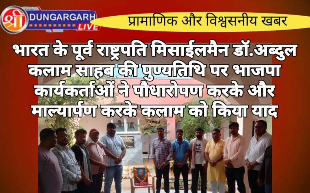 भारत रत्न, भारत के पूर्व राष्ट्रपति और मिसाइलमैन डॉ. एपीजे अब्दुल कलाम साहब की पुण्यतिथि पर नगरपालिका में पौधारोपण करके कलाम के छायाचित्र पर पुष्पांजलि अर्पित करके उनके कार्यों को याद किया । अल्पसंख्यक मोर्चा के प्रदेश कार्यकारिणी सदस्य रोशन छींपा और अल्पसंख्यक मोर्चा के जिलाध्यक्ष इमरान राईन के नेतृत्व में पूर्व राष्ट्रपति डॉ अब्दुल कलाम की पुण्यतिथि पर उनके छायाचित्र पर पुष्पांजलि अर्पित की । इस दौरान महामंत्री महेश राजोतिया,भवानी तावनिया,पार्षद पवन उपाध्याय,विक्रम शेखावत,रामसिंह जागीरदार,रजत आसोपा,गोपाल प्रजापत, महेंद्र सिंह राजपूत,लकी ,अहसान छींपा,आरीफ छींपा,अमन छींपा,नरेंद्र,कमल वाल्मीकि राजेश, महफूज़ आदि ने पौधारोपण कार्यक्रम में शामिल होकर डॉ कलाम को याद किया ।इसके बाद अल्पसंख्यक मोर्चा जिलाध्यक्ष इमरान राईन ने डॉ कलाम के सेवा कार्यों को याद करते हुए गौशाला में गुड़ तथा आवारा गौवंश को हरा चारा देकर सेवा कार्य किया।