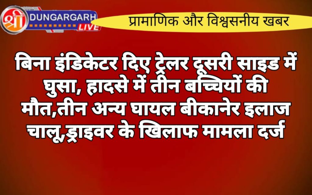हादसे में 3 बच्चियों की मौत हो गई। वहीं हादसे में तीन लोग घायल हो गए है। जिनका बीकानेर के पीबीएम अस्पताल में इलाज चल रहा है। पुलिस ने सीसीटीवी वीडियो के आधार पर ट्रेलर को जब्त कर लिया। वहीं ड्राइवर के खिलाफ मामला दर्ज कर लिया है। पुलिस ने रविवार को तीनों मृतकों के शव का पोस्टमॉर्टम करवाकर परिजनों को सौंप दिया।