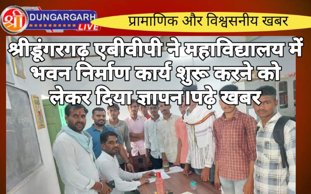 आज अखिल भारतिय विद्यार्थी परिषद द्वारा महाविद्यालय को नवनिर्मित भवन में शुरू करवाने की मांग को लेकर ज्ञापन दिया।मनीष गिरी गोस्वामी ने जानकारी देते हुवे बताया की अस्थाई रूप से चल रहे भवन में कमरों की कमी होने के कारण विद्यार्थियों को काफी परेशानियों का सामना करना पड़ रहा है। ज्ञापन के माध्यम से जल्द से जल्द नवनिर्मित भवन में महाविद्यालय शुरू करवाने की मांग की। प्रांत कार्यकारिणी सदस्य करण जाड़ीवाल ने जल्द महाविद्यालय नवनिर्मित भवन में महाविद्यालय शुरू नही होने पर बड़ा आंदोलन करने की बात कही। इस दौरान मनिष गिरी, किशन, राजपाल, मनिष व मनोज सहित अनेक परिषद कार्यकर्ता मौजूद रहे।