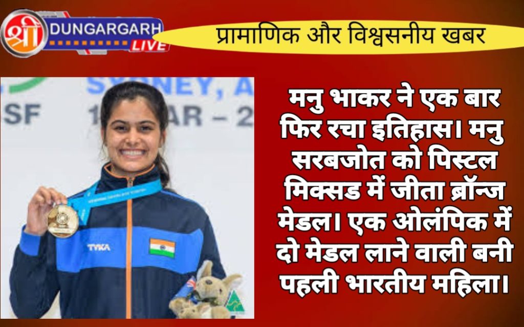 शूटर मनु भाकर ने पेरिस ओलिंपिक में इतिहास रच दिया है। वे एक ही ओलिंपिक गेम्स में दो मेडल जीतने पहली भारतीय महिला बनी हैं। मंगलवार को मनु और सरबजोत की जोड़ी ने 10 मीटर पिस्टल मिक्स्ड टीम इवेंट के ब्रॉन्ज मेडल मैच में कोरिया को यह पेरिस ओलिंपिक में भारत का दूसरा मेडल है। मनु भाकर ने 2 दिन पहले पहला मेडल भी दिलाया था। वे 10 मीटर विमेंस पिस्टल इवेंट में तीसरे स्थान पर रहीं थी।