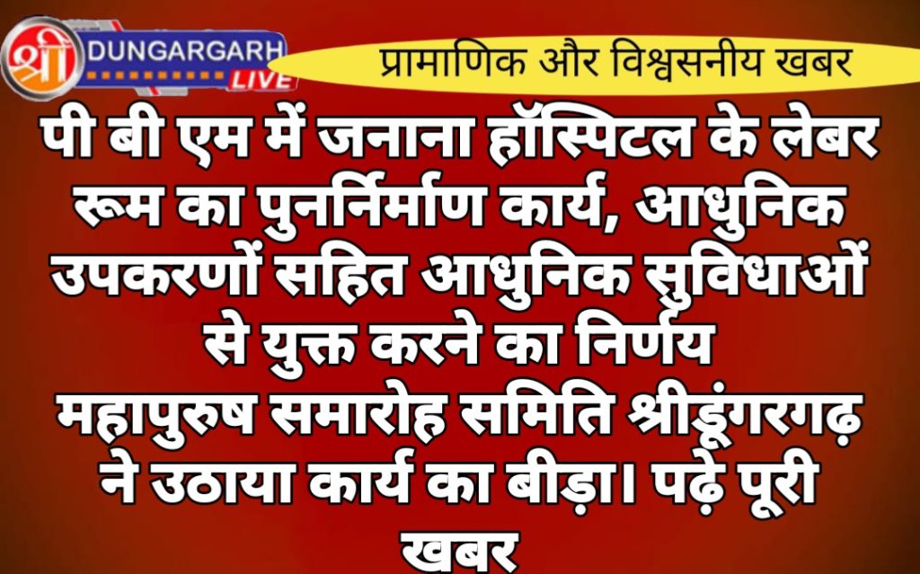 महापुरुष समारोह समिति श्रीडूंगरगढ़ की बैठक श्रीगोपाल राठी की अध्यक्षता में आयोजित की गई । बैठक में शिक्षा, स्वास्थ्य सहित कई बिन्दुओ पर चर्चा हुई । संस्था अध्यक्ष श्रीगोपाल राठी ने कहा कि संस्था राष्ट्र एवं समाज हितार्थ कार्यो के लिए दृढ़ता से सतत प्रयत्नशील है । स्वास्थ्य एवं शिक्षा में सुधार के कार्यो को प्राथमिकता से द्रुत गति से किया जा रहा है । संस्था द्वारा कमजोर एवं गरीब तबके के लाखों लोगों के आस्था का केन्द्र पी बी एम बीकानेर में जनाना हॉस्पिटल के लेबर रूम के पुनर्निर्माण का बीड़ा उठाया गया है । संस्था के मंत्री सुशील सेरडिया ने बताया कि आजकी बैठक में पी बी एम में जनाना हॉस्पिटल बीकानेर के लेबर रूम का पुनर्निर्माण कार्य मय आधुनिक सुविधाओं के करने पर विचार – विमर्श कर कार्य शीघ्र करवाने का निर्णय लिया गया है । पी बी एम हॉस्पिटल के अधीक्षक डॉ पी के सैनी, जनाना हॉस्पिटल की प्रभारी डॉ स्वाति फ्लोदिया, लेबर रूम इंचार्ज डॉ पारुल प्रकाश एवं योग्य इंजीनियरो के साथ बैठक कर हॉस्पिटल के लेबर रूम के पुनर्निर्माण कार्य की योजना तैयार की गई है । समिति सदस्य तुलसीराम चोरड़िया ने बताया देश के बड़े हॉस्पिटलों में दर्ज पी बी एम हॉस्पिटल बीकानेर जिसमें प्रतिदिन औसतन 70 डिलीवरी होती है के जनाना अस्पताल के लेबर रूम का पुनर्निर्माण कार्य दानदाताओं के सहयोग से संस्था द्वारा करवाया जाएगा । समिति सदस्य बजरंगलाल सेवग ने कहा कि संस्था पी बी एम हॉस्पिटल प्रशासन के साथ एम ओ यू कर शीघ्र ही कार्य प्रारम्भ करेगी । संस्था द्वारा करवाए जाने वाले उक्त मरम्मत कार्य के साथ आवश्यक आधुनिक उपकरण भी लगाए जाएंगे । बैठक में विजय महर्षि, संजय करवा, सुरेश भादानी, अशोक पारीक,सुशील सेरडिया उपस्थित रहे ।