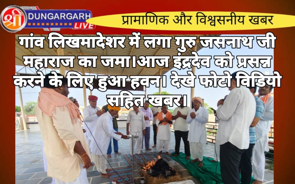 गांव लिखमादेसर में कल रात्रि को हर साल की भांति श्री हंसो जी धाम गुरु जसनाथ महाराज का जमा लगाया गया। गांव के गणगौर चोक पर लगा जमा। महंत भवरनाथ सिद्ध ने गुरु जसनाथ जी की वाणी और भजन सुनाए। जिसमे सभी ग्रामीणों ने भाग लिया पूरे गांव में परसादी बांटी गई । रामप्रताप सहु ने जानकारी देते हुवे बताया की गांव में सालों से चली आ रही परंपरा के तहत गुरु जसनाथ जी का जमा लगाने के दूसरे दिन भगवान इंद्रदेव को प्रसन्न करने के लिए हवन किया जाता है आज सुबह से ही ग्रामीणों ने मिलकर हवन का आयोजन किया। इंद्र देवता को प्रसन्न करनेके लिए बड़ी संख्या में ग्रामीणों ने तिल,जो, घी का हवन किया । इसमें पूरे गांव का सहयोग रहा । हवन में बैठे ग्रामीणों में सरपंच प्रतिनिधि राधेश्याम सिद्ध, पन्नानाथ सिद्ध, पुरखनाथ सिद्ध,ओमनाथ, राम प्रताप सहू, लिछुराम ज्यानी,रामप्रताप सिध, पंडित बजरंग लाल शर्मा, बाबूलाल शर्मा, राकेश और ग्रामीण उपस्थित रहे।
