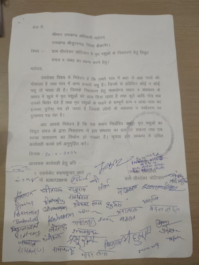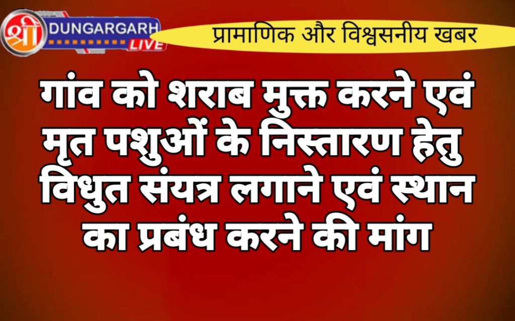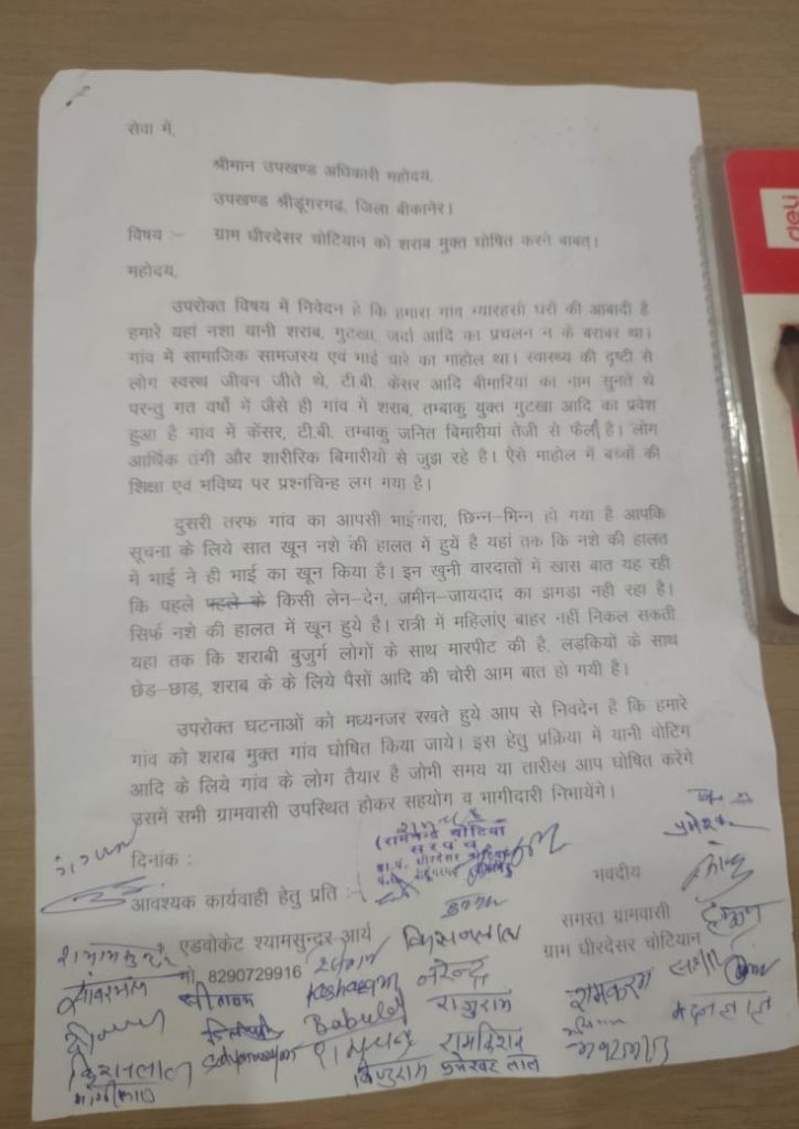 धीरदेसर चोटियान में मंगलवार को रात्रि में आयोजित चौपाल में ग्रामवासियों ने गांव को शराब मुक्त करने एवं गांव में मृत पशुओं के निस्तारण हेतु विधुत संयत्र लगाने एवं जगह का प्रबंध करने की मांग उपखंड अधिकारी श्रीडूंगरगढ़ को ज्ञापन देकर की गई । एडवोकेट श्याम सुंदर आर्य ने बताया कि गांव में शराब के कारण सामाजिक ढांचा ध्वस्त हो रहा है । परिवारों एवं महिलाओं की स्थिति दयनीय हो गई है । आए दिन लड़ाई झगड़े हो रहे है, इसके कारण कई मर्डर हो गए । गांव में शराब को लेकर गहरा आक्रोश है । ग्रामवासी शराबबन्दी को लेकर वोटिंग करने को तैयार है । इसके साथ ही गांव में मृत पशुओं के कारण दुर्गन्ध फैल रही है । इसके निस्तारण हेतु स्थान का प्रबंध एवं निस्तारण हेतु विधुत संयत्र लगाने की मांग जनहित में की गई है ।