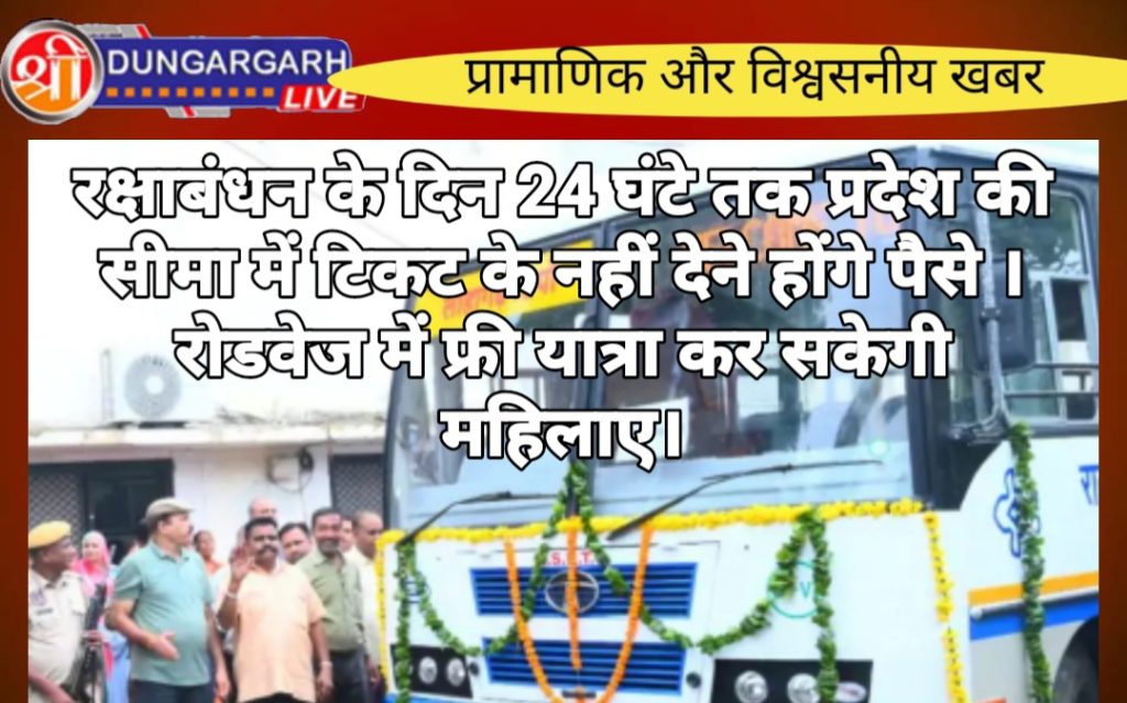 रक्षाबंधन के मौके पर प्रदेश में 19 अगस्त को राजस्थान रोडवेज की बसों में महिलाएं फ्री यात्रा कर सकेंगी। राजस्थान राज्य पथ परिवहन निगम की ओर से बुधवार को आदेश जारी किया गया है। आदेश के अनुसार 19 अगस्त 2024 को रक्षाबंधन पर्व के अवसर पर प्रदेश की सभी महिलाएं/बालिकाएं राजस्थान राज्य पथ परिवहन निगम की ओर से संचालित सभी कैटेगरी की बसों में फ्री यात्रा कर सकेंगी। फ्री यात्रा की सुविधा एसी, वॉल्वो, और ऑल इंडिया परमिट की बसों में लागू नहीं होगा।