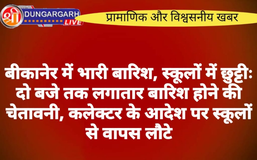 विभाग द्वारा जारी भारी बारिश की चेतावनी के मद्देनजर ज़िला कलेक्टर एव ज़िलाशिक्षा अधिकारी से प्राप्त मौखिक निर्देशानुसार आज दिनांक 02/08/2024 को बीकानेर शहर के सभी सरकारी एव निजी शिक्षण संस्थाओं में अवकाश घोषित किया गया है। अवकाश की स्थति में यदि कोई शिक्षण संस्था संचालित होता पाया जाता है तो होने वाली विभागीय कार्यवाही के लिए संस्था प्रधान /सचिव स्वय जीमेवार होंगे ।