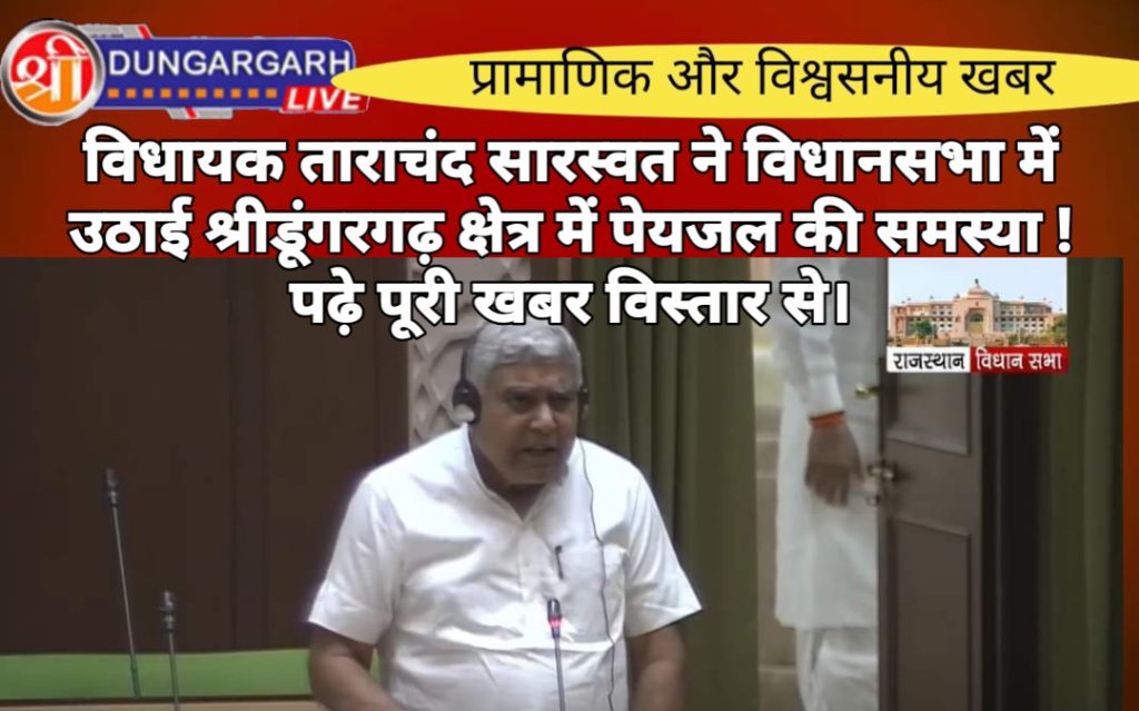 श्रीडूंगरगढ़ विधायक ताराचंद सारस्वत ने राजस्थान विधानसभा में राज्य में पेयजल पर विचार में बोलते हुए कहा कि श्रीडूंगरगढ़ विधान सभा में कुल 117 गांव व कस्बा आता है।विधानसभा क्षेत्र में सभी पेयजल योजनाएं भूजल पर आधारित है और भूजल स्तर लगातार नीचे गिरता जा रहा है।