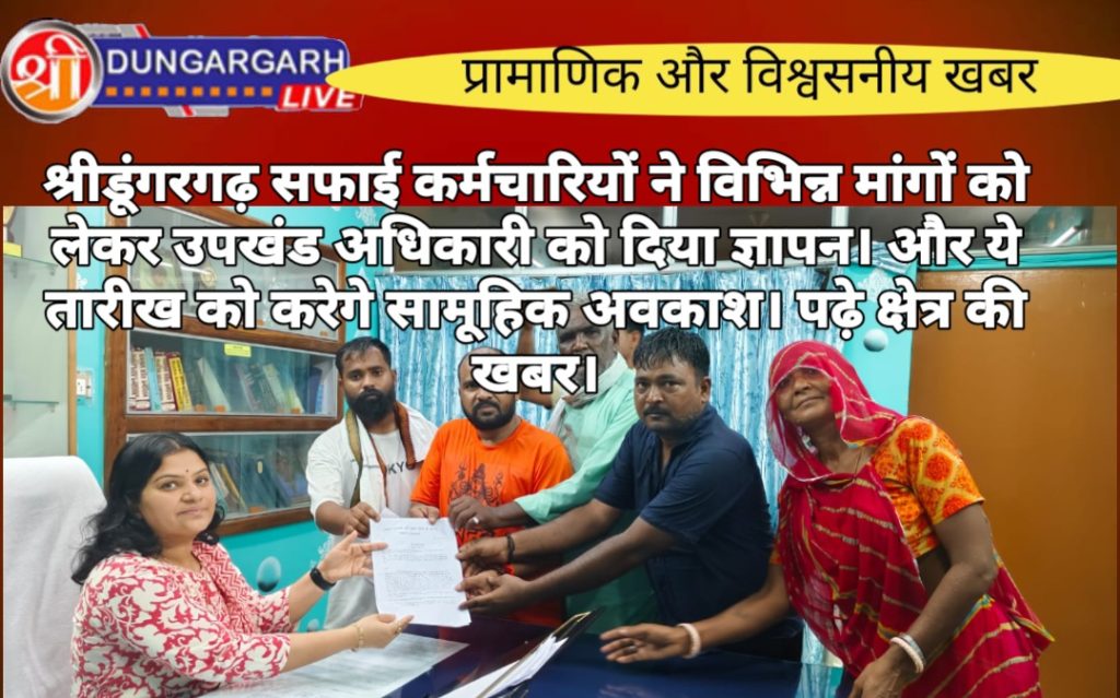 जयपुर शहर सहित सम्पूर्ण राजस्थान प्रदेश में सफाई कर्मचारी सामूहिक अवकाश लेकर कार्य का बहिष्कार कर रहे है। ओर आज श्रीडूंगरगढ़ में सफाई कर्मियों ने विरोध प्रदर्शन करते हुवे उपखंड अधिकारी को ज्ञापन दिया है विरोध प्रदर्शन में बताया की सयुक्त वाल्मीकि एवं सफाई श्रमिक संघ एवं निदेशक स्थानीय निकाय विभाग, जयपुर के निदेशक की अध्यक्षता दिनांक 23.01 2024 को समझौता समिती की बैठक आयोजित की गई थी जिस बैठक में निदेशक महोदय द्वारा लिखित में समझौता किया गया था कि सफाई कर्मचारियों की भर्ती प्रक्रिया दिनाक 06.02.2025 से प्रारंभ की जाएगी एवं आश्वासन दिया गया कि सफाई भर्ती मस्टरोल के आधार पर एक वर्ष तक जो सफाई कार्य करेगा उन्हें नियुक्ति दी जायेगी इस आश्वासन पर सहम्मति जताते हुऐ समझौता पत्र पर हस्ताक्षर कर दिनांक 24.01.2024 को आंदोलन स्थगीत किया गया था परन्तु स्वायत शासन विभाग द्वारा जारी विज्ञप्ति दिनांक 01.03.2024 में सफाई कर्मचारी भर्ती लौटरी एवं प्रेक्टिकल के आधार पर भर्ती करने की विज्ञप्ति जारी की गई जो स्वायत शाशन विभाग, जयपुर की तानाशाही बताया। इस संबंध में सफाई कर्मचारी भर्ती सघर्ष समिति श्रीडूंगरगढ़ विरोध प्रदर्शन करते हुए दिनाक 04.08.2024 को सामूहिक अवकाश पर जाने की घोषणा की ओर विभिन्न मांगो को लेकर ज्ञापन दिया