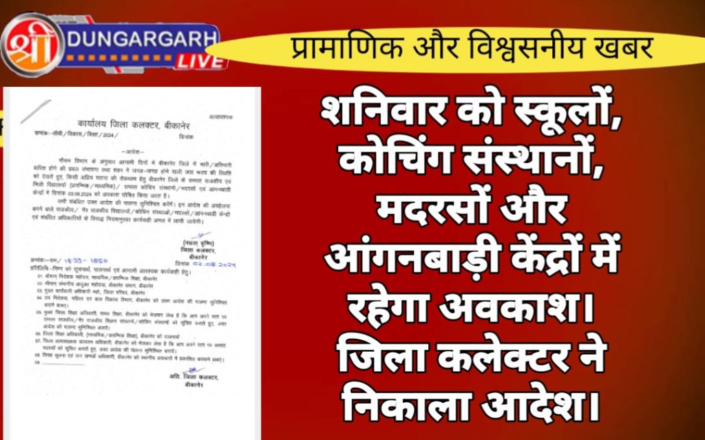 मौसम विभाग के अनुसार आगामी दिनों में बीकानेर जिले में भारी/अतिभारी बारिश होने की प्रबल संभावना तथा इस कारण जलभराव की संभावित स्थिति को देखते हुए जिले के समस्त राजकीय एवं निजी (प्रारम्भिक/माध्यमिक) विद्यालयों, समस्त कोचिंग संस्थानों, मदरसो एवं आंगनबाड़ी केन्द्रों में शनिवार को अवकाश रहेगा। जिला कलक्टर नम्रता वृष्णि ने इस संबंध में आदेश जारी किया है। आदेश अनुसार सभी को इस की पालना सुनिश्चित करनी होगी। अवहलेना करने वाले संस्थानों और अधिकारियों के विरूद्ध नियमानुसार कार्यवाही अमल में लाई जाएगी।