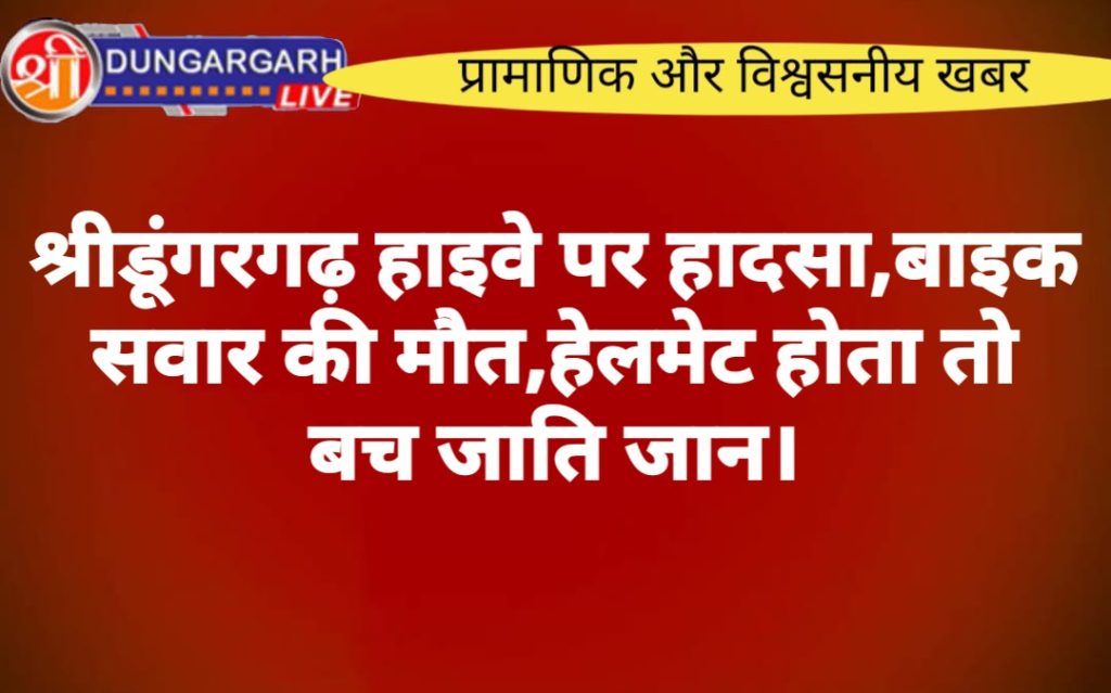 अभी कुछ देर पहले नेशनल हाई वेस्थित बिग्गा बास रामसरा के स्टैंड के पास एक बाइक व गाय में टक्कर हो गई है। मिली जानकारी के अनुसार बाइक सवार गंभीर रूप से घायल हो गया। गरीब सेवा संस्थान कि एम्बुलेंस उसे उपजिला अस्पताल लेकर पहुंची जहाँ घायल को मृत घोषित कर दिया गया। शव को अभी अस्पताल कि मोर्चरी में रखावाया गया है। पुलिस पहुंची मौके पर ।मृतक कि पहचान हो चुकी है लेकिन मानवीय संवेदना से उनका प्रकाशन नही किया जा रहा है। बाइक सवार के पास होता हेलमेट तो बच सकती थी जान । श्रीडूंगरगढ़ लाइव न्यूज़ की अपील बाइक चलाते वक्त हेलमेट जरूर पहने।