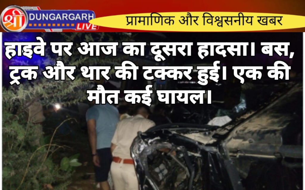 नेशनल हाईवे पर सेरूणा थाना क्षेत्र में हुए हादसे में एक की मौत हो गई जबकि कई घायल हो गए मिली जानकारी के अनुसार बीकानेर जयपुर स्लीपर बस सामने से आ रही थार गाड़ी से टकरा गई वहीं बस के पीछे चल रहा है ट्रेलर भी टकरा गया घटना की जानकारी मिलने पर सेरूणा पुलिस मौके पर पहुंची और कई जगह से एंबुलेंस भी घटना स्थल पर पहुंची वहीं दो गंभीर घायलों को 108 की मदद से बीकानेर भेजा गया है। जबकि एक युवक की मौके पर ही मौत हो गई है जिसके शव को श्रीडूंगरगढ़ अस्पताल की मोर्चरी भेजा गया है फिलहाल मृतक की अभी पहचान नहीं हो पाई है पुलिस ने हाइवे पर यातायात व्यवस्था को बहाल कर दिया है।