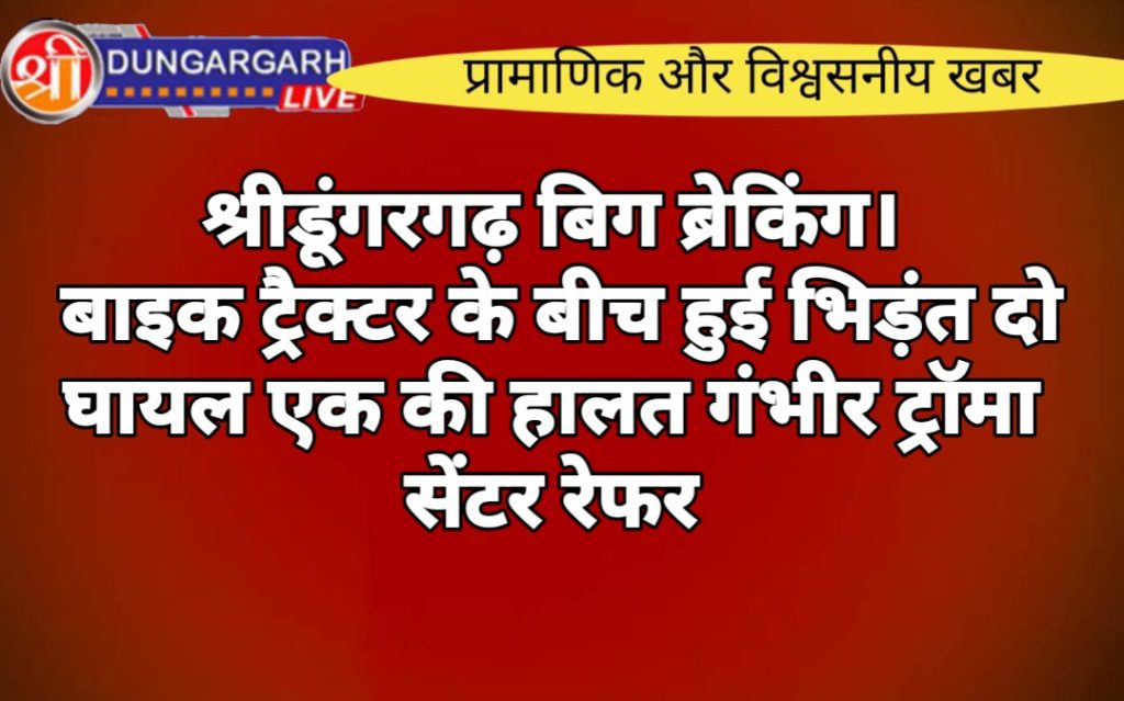 श्रीडूंगरगढ़ के कालू रोड पर हुआ हादसा। बाइक ट्रैक्टर के बीच भिड़ंत होने से दो लोग घायल होने का समाचार मिला। जिसमें एक की हालत गंभीर होने पर बीकानेर पीबीएम ट्रॉमा सेंटर रेफर किया गया है। मिली जानकारी के अनुसार 108 एम्बुलेंस मौके पर पहुंची और घायलों को श्रीडूंगरगढ़ लाया गया जहां प्राथमिक उपचार करने के बाद गंभीर घायल मूल सिंह उम्र 65 साल को बीकानेर पीबीएम ट्रॉमा सेंटर रेफर किया गया जबकि दूसरे युवक मोहन सिंह की हालत सामान्य बताई गई है।