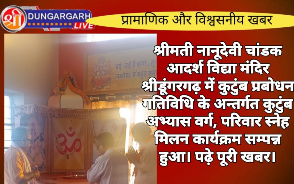 कल सायं 6.00 बजे श्रीमती नानूदेवी चांडक आदर्श विद्या मंदिर श्रीडूंगरगढ़ में कुटुंब प्रबोधन गतिविधि के अन्तर्गत कुटुंब अभ्यास वर्ग, परिवार स्नेह मिलन कार्यक्रम सम्पन्न हुआ। के इस भव्य एवं सादगीपूर्ण कार्यक्रम में श्रीनंदलाल जोशी राजस्थान क्षेत्र कार्यकारिणी सदस्य का सानिध्य प्राप्त हुआ । नंदलाल जोशी ने भारतमाता के चित्र के समक्ष दीप प्रज्ज्वलन के पश्चात् रोचक भजनों के माध्यम से सुखी व संस्कारित परिवार बनने का तरीका समझाया।