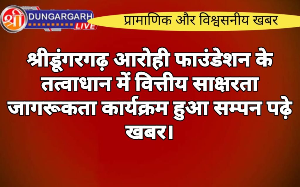 आरोह फाउंडेशन के तत्वाधान में बिग्गा ग्राम पंचायत भवन में वित्तीय साक्षरता जागरूकता कार्यक्रम का आयोजन किया गया कार्यक्रम में मुख्य अतिथि के रूप में वित्तीय साक्षर परमार्शदाता आशकरण लखारा , ग्राम बिग्गा पंचायत के सरपंच प्रतिनिधि अशोक सारण विशिष्ट अतिथि के रूप में फाइनेंशियल काउंसलर राजकुमार CFL लूणकरणसर, महावीर जालप सीएफएल पांचू मौजूद रहे। लखारा ने संबोधित करते हुए प्रधानमंत्री सुरक्षा बीमा योजना, प्रधानमंत्री जीवन ज्योति बीमा योजना , अटल पेंशन योजना ,और सुकन्या योजना के बारे में लोगों को अवगत करवाया लोगों को ज्यादा से ज्यादा इंश्योरेंस से जोड़ने के लिए प्रेरित किया और डिजिटल फ्रॉड के बारे में बताया गया । लोगों को लोन संबंधी जानकारी दी,और धोखाधड़ी से कैसे बच सकते है इसकी जानकारी दी गई छगनलाल एफसी ने सुकन्या योजना के बारे में महावीर जालप ने संबोधित करते हुए कुछ योजनाओं के बारे में बताया श्रीडूंगरगढ़ ब्लॉक के असिस्टेंट फाइनेंशियल काउंसलर छगनलाल ने आए हुए ग्रामवासियों का आभार व्यक्त किया।