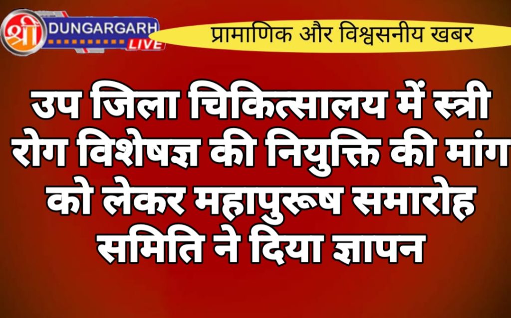 महापुरूष समारोह समिति द्वारा मंगलवार को उप जिला चिकित्सालय में स्त्री रोग विशेषज्ञ का लम्बे समय से रिक्त चल रहे पद को शीघ्र भरने की मांग को लेकर मुख्यमंत्री भजनलाल शर्मा व चिकित्सा मंत्री गजेंद्र सिंह के नाम ज्ञापन उपखण्ड अधिकारी श्रीडूंगरगढ़ को सौंपा एवं स्थानीय विधायक ताराचन्द सारस्वत को ज्ञापन देकर इस समस्या के शीघ्र समाधान करवाने की मांग की गई। संस्थाध्यक्ष श्रीगोपाल राठी ने बताया कि उप जिला चिकित्सालय में लंबे समय से स्त्री रोग विशेषज्ञ का पद रिक्त चल रहा है, जिससे आम जनता को भारी समस्याओं का सामना करना पड़ रहा है। इस कारणवश महिलाओं को गर्भावस्था, प्रसव और अन्य स्त्री रोग संबंधी समस्याओं के इलाज के लिए दूर-दराज के अस्पतालों में जाना पड़ता है, जिससे समय और धन की बर्बादी हो रही है।