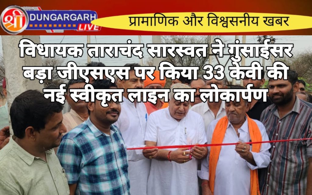 श्रीडूंगरगढ़ विधायक ताराचंद सारस्वत ने गुरुवार को गुसाईंसर बड़ा जीएसएस को 33 केवी की एक नई लाइन से जोड़ने के कार्य का लोकार्पण किया। विभाग द्वारा 20 किलोमीटर लाइन खींच कर गुरूवार को इसे चालू कर दिया गया है। विधायक ने फीता काट कर इस कार्य का लोकार्पण किया और ग्रामीणों को बधाई दी। इस अवसर पर सारस्वत ने कहा कि क्षेत्र में निर्बाध बिजली आपूर्ति सुनिश्चित करवाने के प्रयास किए जा रहे हैं। जिससे खेती उद्योग के साथ घरेलू उपभोक्ताओं को राहत मिल सकेगी।
