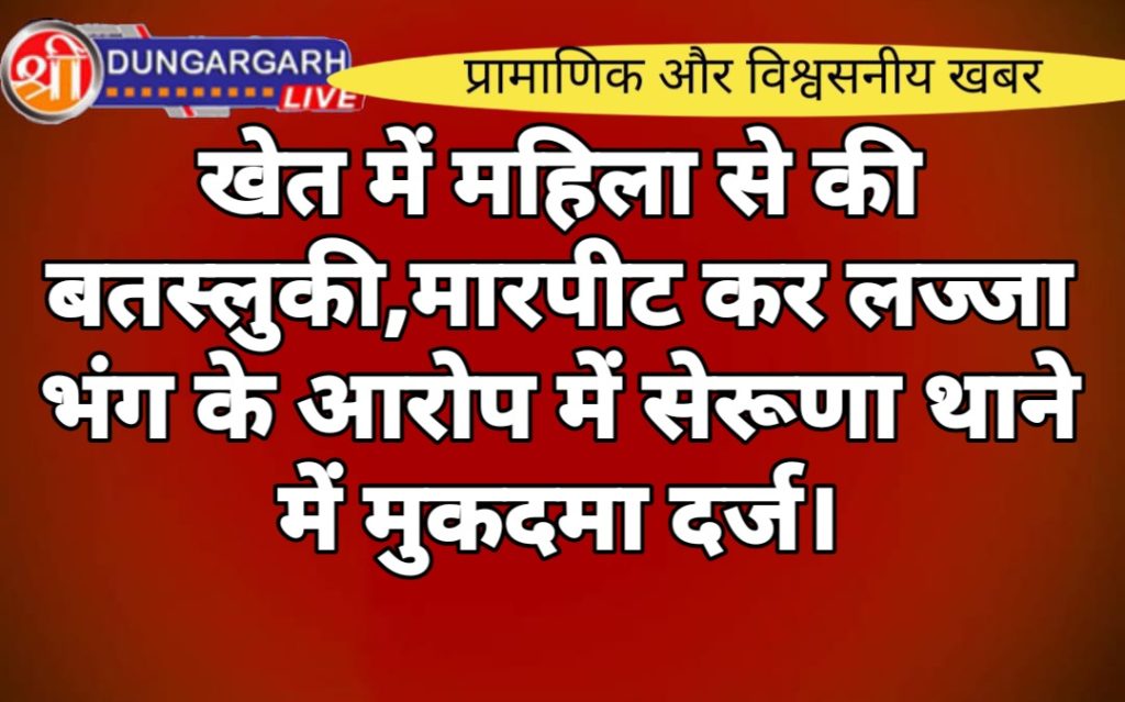 सेरूणा थाने में मुकदमा दर्ज करवाते हुवे प्राथी चेल कंवर पति करणी सिंह निवासी झंझेऊ ने बताया की में अपने खेत में काम कर रही थी तभी आरोपी कालू सिंह पुत्र हेम सिंह निवासी 4DLSM छतरगढ़,गुमान सिंह पुत्र बादर सिंह निवासी 1बीएसएम अनूपगढ़, पदमसिंह पुत्र कालू सिंह निवासी चक 1बीएसएम अनूपगढ़ तीनो आरोपी गाड़ी लेकर आए। गाड़ी नंबर आरजे07 ua 2954 है आरोपियों ने आते ही महिला के साथ बतस्लुकी करने लगे,महिला की ओढ़नी फाड़ी और लजा भंग करके मारपीट की तभी प्राथी महिला का लड़का दूर काम कर रहा था महिला के चिलाने पर भाग कर आया और छुटाया। लड़के के साथ भी आरोपियों ने मारपीट की । प्राथी महिला ने बताया की आरोपी हमारे पुस्तेनी खेत को बेचने के लिए दबाब बनाते है और आए दिन झगड़ा करते है । सेरूणा पुलिस ने आरोपियों के खिलाफ मुकदमा दर्ज कर लिया है।