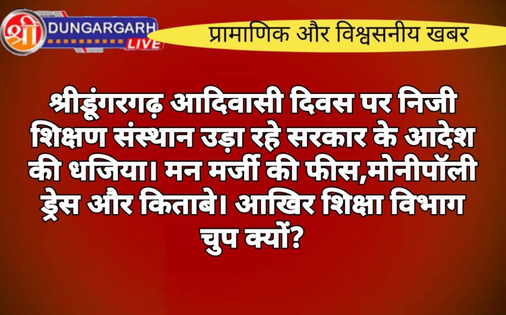 आज आदिवासी दिवस पर राज्य सरकार की छुट्टी के बाद भी कुछ निजी स्कूल खुले रहे और हमेशा की भांति बच्चों को स्कूल बुलाया गया जबकि सरकार का स्पष्ट निर्देश था कि कोई भी निजी या सरकारी शिक्षण संस्थान खुले नहीं रहेंगे लेकिन सरकार की नियमों की पूरी तरह से धज्जियां उड़ाते नजर आए निजी स्कूल संचालक । आज पूरे प्रदेश में सरकारी और निजी शिक्षण संस्थान बंद है लेकिन श्रीडूंगरगढ़ में आधे निजी शिक्षण संस्थान चालू रहे । आखिर हो क्या रहा है या ये निजी शिक्षण संस्थान सरकार के दायरे में नहीं आते है क्या । शिक्षा विभाग इस पर चुप क्यों है।क्यों न इन पर कारवाई हो।मन मर्जी की फीस और मोनोपॉली ड्रेस जो इन शिक्षण संस्थान की एक ही दुकान पर मिलती है दुकानदार भी मन मर्जी की रेट लगाता है जानबूझकर सरकार के आदेश की अवहेलना कर रहे थे अब देखना होगा की शिक्षा विभाग के अधिकारी इन लापरवाह लोगों के खिलाफ क्या कार्रवाई करते हैं।