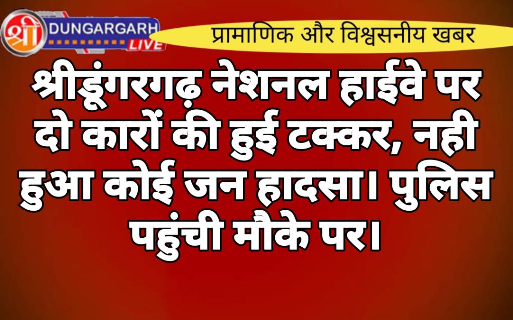 क्षेत्र में लगातार सड़क दुर्घटनाएं बढ़ती जा रही है ।नेशनल हाईवे 11 पर खाखी धोरे के पास दो कारों के बीच भिड़ंत होने की जानकारी सामने आई है। गनीमत रही कि किसी भी तरह से कोई जनहानि नहीं हुई घटना की जानकारी मिलने पर एएसआई हेतराम पुलिस टीम के साथ मौके पर पहुंचे और मामले की जांच में जुट गए वहीं पुलिस ने दोनों ही वाहनों को थाने लाकर खड़ा करवा दिया है फिलहाल किसी भी तरह से कोई मुकदमा दर्ज नही हुआ है।
