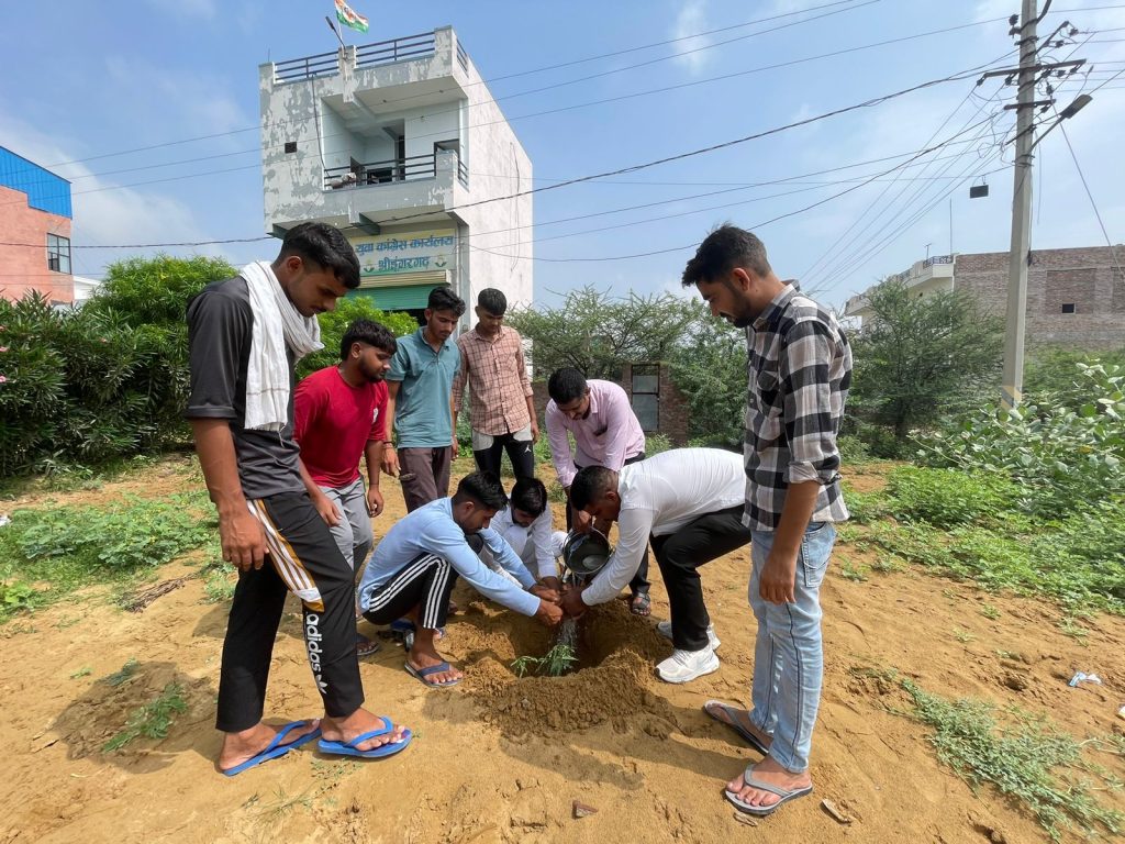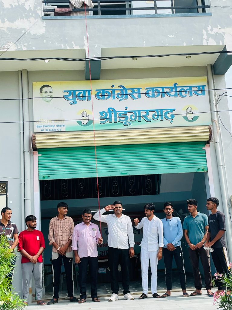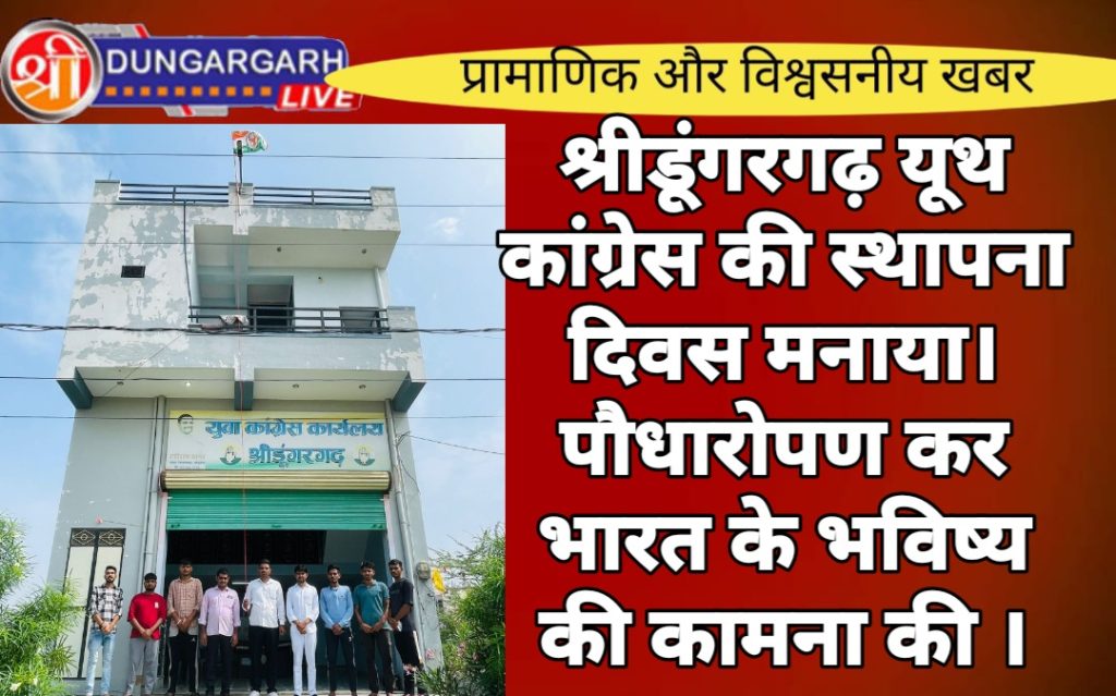 श्रीडूंगरगढ़ यूथ कांग्रेस ने पौधरोपण कर मनाया स्थापना दिवस। एक पेड़ भारत के भविष्य के नाम के तहत राष्टव्यापी पौधरोपण किया गया युवा नेता हरिराम बाना के नेतृत्व में यूथ कांग्रेस के तहसील अध्यक्ष संतोष गोदारा की अगुवाई में यूथ कांग्रेस कार्यलय परिसर में किया गया पौधरोपण। अनेक युवाओं ने लिया भाग । युवा कांग्रेस विधानसभा अध्यक्ष संतोष गोदारा ने बताया की एक पेड़ सभी भारत के भविष्य के लिए लगावे।आज युवा कांग्रेस स्थापना दिवस पौधारोपण कर मनाया गया !!जिसमें शुभम शर्मा,खियाराम गोदारा,विजयपाल जाखड़, मुकेश जाट,गौतम कुमार,नानूराम गोदारा,भागीरथ चौधरी,मोडराम बुड़िया,सुभाष गोदारा आदि उपस्थित रहे !!