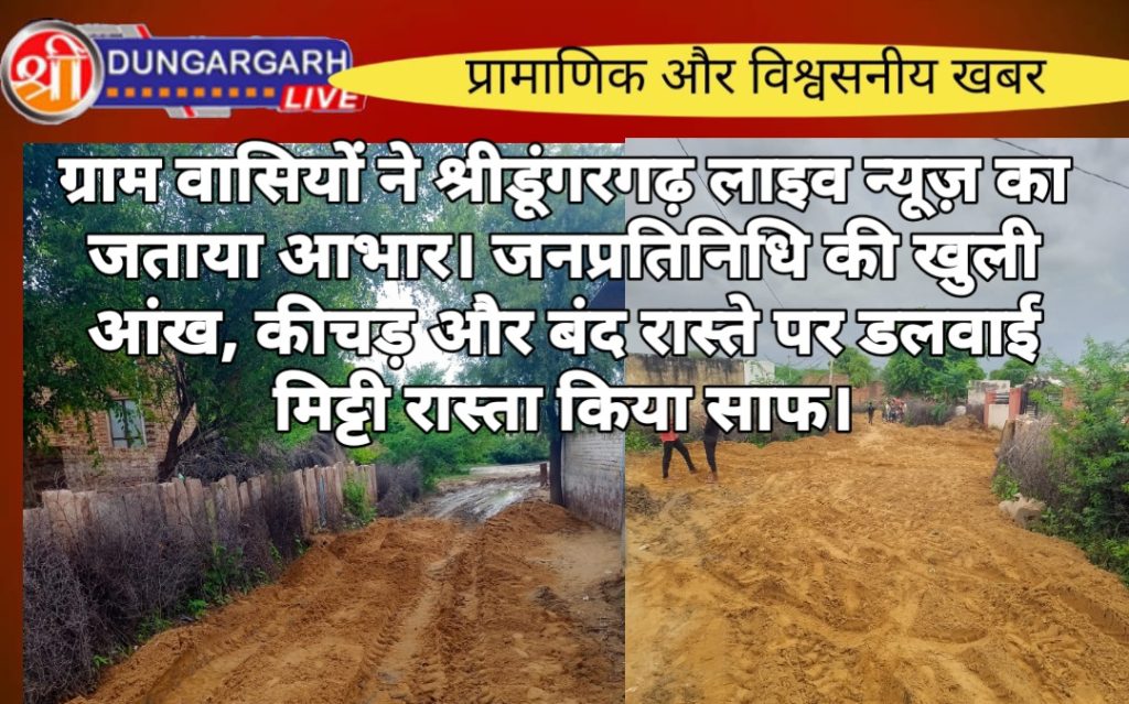श्रीडूंगरगढ़ लाइव न्यूज़ के खबर का असर पांच गांवो के बंद हुवे रास्ते पर आज धोलिया ग्राम में जनप्रतिनिधि ने रास्ता साफ करवा कर मिट्टी डलवाई है ओर रास्ता साफ करवा दिया। आसपास के घरों में रहने वाले ग्रामीणों को बदबू से निजात मिली है। आने जाने वाले वाहनों को अब दूसरी साइड से नही जाना पड़ेगा कल ही श्रीडूंगरगढ़ लाइव न्यूज़ पर खबर लगी थी। युवाओं और ग्रामीणों ने श्रीडूंगरगढ़ लाइव न्यूज का आभार व्यक्त किया है। गांव के युवाओं ने बताया की इस तरह अगर जनप्रतिनिधि कार्य करते रहे तो रोष व्यक्त करने की जरूरत ही नही परेगी। हालाकि कुछ युवाओं का कहना है की इस रास्ते पर बरडा डाल कर ब्लॉक लगा देते तो फिर दुबारा यह समस्या नहीं बनती अभी तो मिट्टी पानी के साथ बह जायेगी और पुनः कीचड़ हो जायेगा।