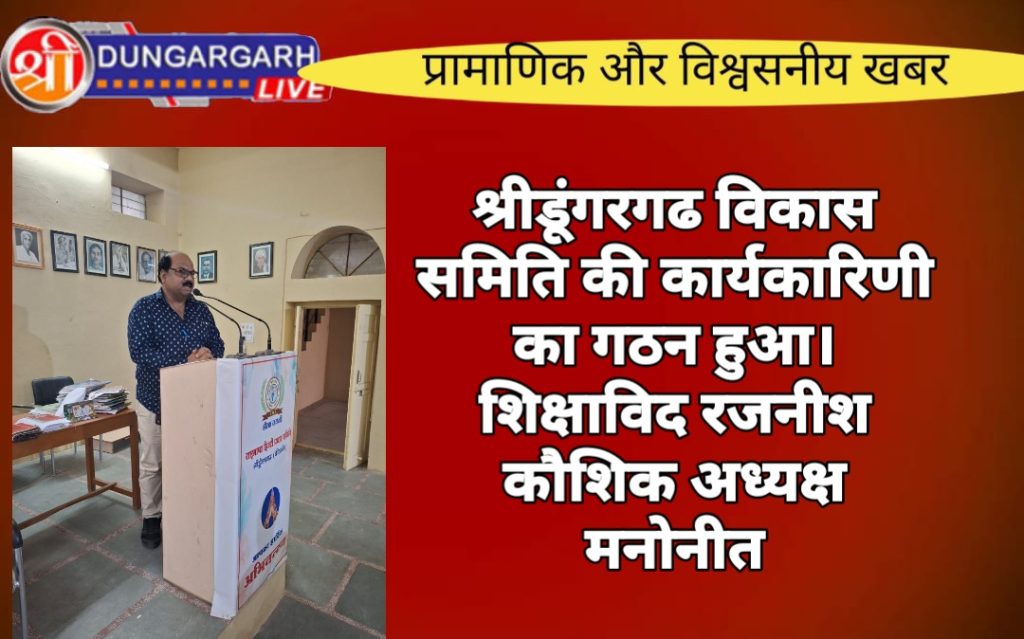 रविवार को श्रीडूंगरगढ विकास समिति की बैठक राष्ट्रभाषा हिन्दी प्रचार समिति के प्रांगण में हुई। बैठक में सर्व सम्मति से शिक्षाविद रजनीश कौशिक को अध्यक्ष बनाया गया जबकि समिति के दो उपाध्यक्ष घनश्यामदास स्वामी तथा आनंद जोशी को बनाया गया। मंत्री राजेश शर्मा, कोषाध्यक्ष तरुण गुसांई, मीडिया प्रभारी अशोक पारीक चुने गए, वहीं कार्यकारिणी सदस्यों के रूप में एडवोकेट मोहनलाल सोनी, एडवोकेट दीपिका करनाणी, मदन सोनी, प्रदीप पुगलिया, शूरवीर मोदी, महावीर सारस्वत, आनंद मारू, अनमोल मोदी, मनोज डागा, राजेन्द्र स्वामी, हरि सिखवाल को चुना गया वहीं संरक्षक तोलाराम मारू, चेतन स्वामी को बनाया गया।