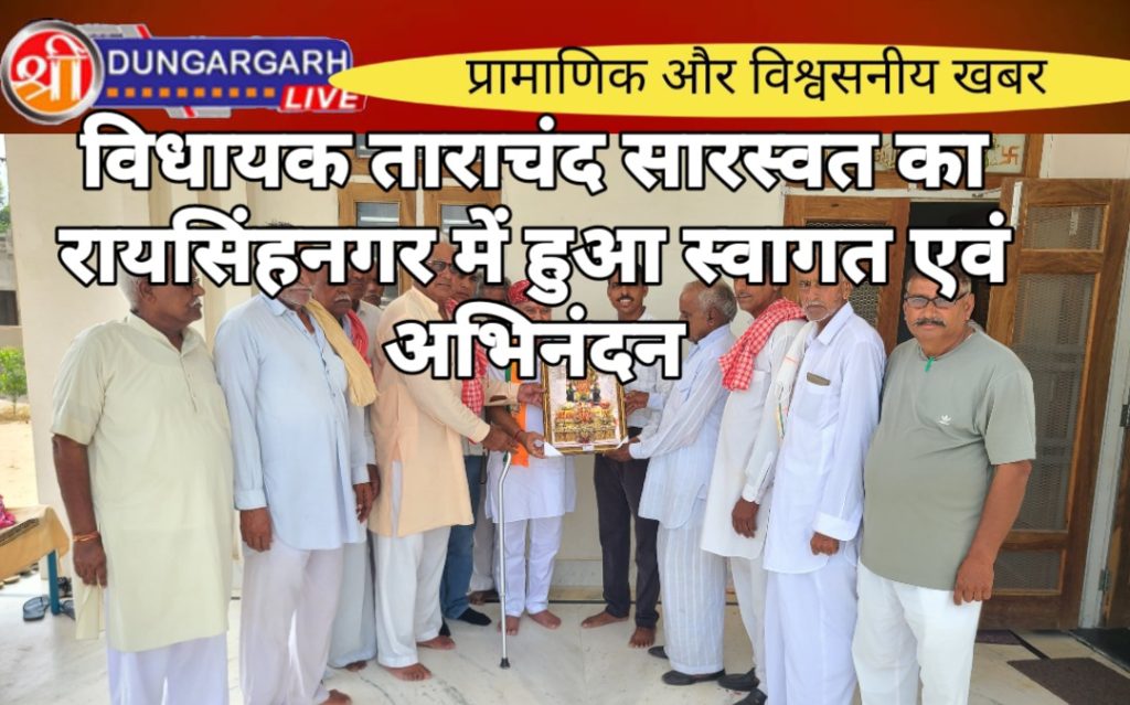 आज श्रीडूंगरगढ़ विधायक ताराचंद सारस्वत रायसिंहनगर प्रवास के दौरान वेद प्रकाश ठण्डी (सारस्वत) के निवास स्थान पर किया सम्मान। इस अवसर विधायक सारस्वत का ग्रामवासियों ने माला और शॉल ओढ़ाकर सम्मानित किया। स्वागत कार्यक्रम में पृथ्वीराज सारस्वा (राजेरा), हेमराज जोशी, बृजलाल जोशी,चैनसुख राम सारस्वत,रामेश्वर लाल पांडीया, लादूराम जोशी, पालाराम जोशी, बंशीधर पांडीया, राजाराम जोशी, शांति स्वरूप जोशी, मुरलीधर जोशी, गुगनाराम जोशी, डूंगर राम जोशी, डालचंद जोशी सहित अनेक समाज के गणमान्य व्यक्ति मौजूद रहे।