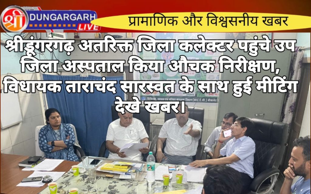 श्रीडूंगरगढ़ उप जिला अस्पताल का निरीक्षण करने के लिए अतिरिक्त जिला कलेक्टर दुलीचंद मीणा पहुंचे है और अस्पताल का निरीक्षण किया। विधायक ताराचंद सारस्वत के साथ हुई मीटिंग। वही जनाना हॉस्पिटल के वार्ड का निरीक्षण किया गया और रोगियों से फीड बैक लिया गया है। उप जिला अस्पताल के व्यवस्थाओं के बारे में हुई चर्चा विधायक ताराचंद सारस्वत, एडीएम दुलीचंद मीणा, उपखंड अधिकारी उमा मितल, डॉ एस के बिहानी, तहसीलदार राजवीर कड़वासरा, ईओ अविनाश शर्मा, बीसीएमएचओ राजीव सोनी,रमेश मुधरा,भवानी प्रकाश तावणीयां आदि रहे मौजूद।