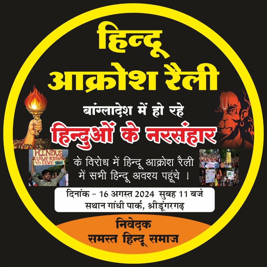 बांग्लादेश में हिंदुओं के खिलाफ हो रहे अमानवीय अत्याचार एवं नरसंहार के विरोध में हिन्दू आक्रोश रैली आज कस्बे के मुख्य बाजार स्थित गांधी पार्क से निकलेगी। प्रसिद्ध कथावाचक भरतशरण जी महाराज के सान्निध्य में समस्त हिन्दू समाज द्वारा 11 बजे रैली के रूप में इकट्ठा होकर उपखण्ड अधिकारी श्रीमती उमा मित्तल को ज्ञापन देगी। उल्लेखनीय है कि बांग्लादेश में तख्ता पलट के बाद अल्पसंख्यक वर्ग और हिन्दू समाज के खिलाफ अत्याचार और नरसंहार की खबरे आ रही है।
