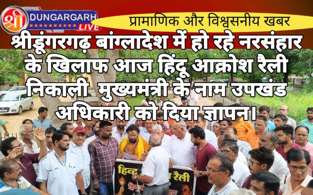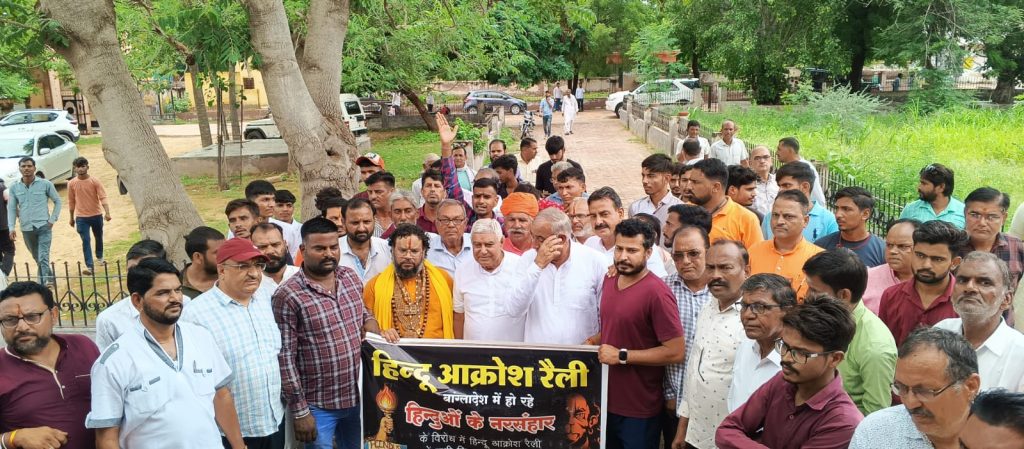 बांग्लादेश में हिंदू समुदाय पर हो रहे अत्याचारों के खिलाफ महंत भरत शरण जी महाराज के सान्निध्य में सर्व हिंदू समाज के सदस्यों ने आज उपखण्ड अधिकारी को प्रधानमंत्री और राष्ट्रपति के नाम ज्ञापन सौंपा। इस दौरान विधायक ताराचंद सारस्वत व श्री विश्वकर्मा कौशल विकास बोर्ड के अध्यक्ष रामगोपाल सुथार, ओबीसी मोर्चा जिला अध्यक्ष विनोद गिरी गोस्वामी मौजूद रहे। सभी कस्बे के गांधी पार्क में एकत्रित हुए और वहां से रैली के माध्यम से विरोध जताते हुए भारत माता के जयकारों के साथ पैदल पंचायत समिति पहुँचे, जहां उपखण्ड अधिकारी को ज्ञापन सौंपा गया।