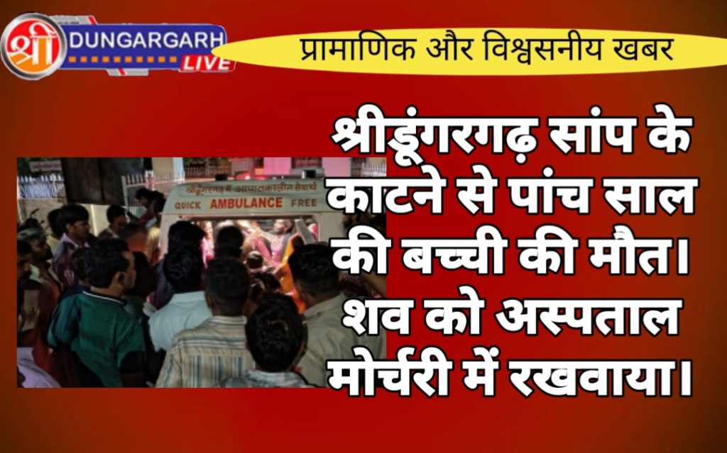 सांप के काटने से पांच साल की बच्ची की मौत। निर्मला पुत्री वकील बंजारा की मौत हो गई।बच्ची अपने परिवार के साथ श्रीडूंगरगढ़ के लाछड़सर गांव में एक गौशाला में रहती थी। ये लोग भुना, फतेहाबाद, हरियाणा के निवासी है जो फिलहाल लाछड़सर गांव में एक गौशाला में काम करते है।जानकारी के अनुसार घटना बाद परिजन बच्ची को पहले गोगामेड़ी ले गए, जहां काफी समय बिताने के बाद उसे अस्पताल ले जाया गया। उप जिला अस्पताल में डॉक्टरों ने बच्ची को मृत घोषित कर दिया। बच्ची का शव अस्पताल के मोर्चरी में रखवाया गया है।सूचना मिलते ही अस्पताल में डॉ. एपीजे अब्दुल कलाम वेलफेयर ट्रस्ट के सदस्य भी पहुंचे और अस्पताल में भीड़ इकट्ठी हो गई। परिजन बच्ची की मौत पर रोने लगे।