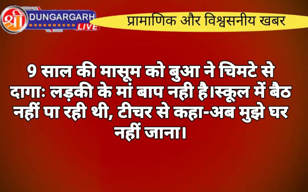 लूणकरणसर थानाधिकारी गणेश विश्नोई ने बताया- राजकीय विद्यालय की प्रधानाचार्या की रिपोर्ट पर बुआ के खिलाफ मामला दर्ज किया है। थानाधिकारी ने बताया कि बच्ची की उम्र 9 वर्ष है और लूणकरणसर के एक स्कूल में चौथी क्लास में पढ़ती है। उन्होंने बताया कि बच्ची का मेडिकल करवाया गया है। पुलिस ने बच्ची को नारी निकेतन भेज दिया है।ठीक से बैठ नहीं पा रही थी