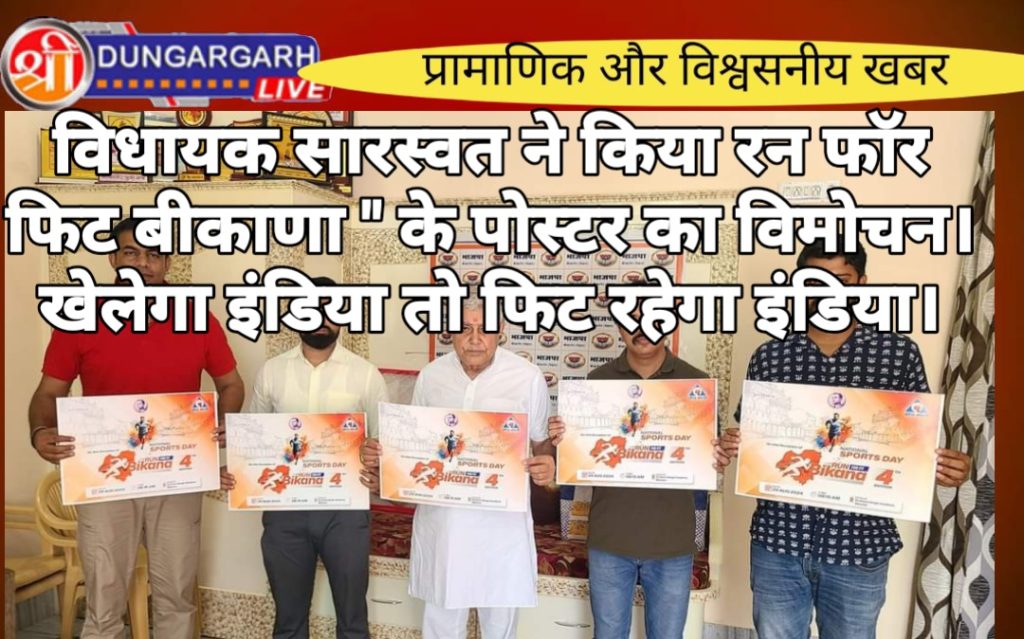 आज विधायक ताराचंद सारस्वत ने बीकानेर में हॉकी के जादूगर मेजर ध्यानचंद की जयंती के उपलक्ष पर मनाए जाने वाले राष्ट्रीय खेल दिवस के अवसर पर एकलव्य फाउंडेशन राजस्थान एवं क्रीड़ा भारती बीकानेर के संयुक्त तत्वाधान में 29 अगस्त को आयोजित होने वाले ” रन फॉर फिट बीकाणा ” के पोस्टर का विमोचन किया!!विधायक सारस्वत ने कहा खेलेगा इंडिया तो फिट रहेगा इंडिया प्रधानमंत्री श्री नरेंद्र मोदी का विजन हैं की युवा खेलो में भाग लेना चाहिए। विधायक सारस्वत ने कहा कि युवाओं को नशे से दूर रहकर खेलो से जुड़ने का आव्हान किया खेलो में भाग लेने से मानसिक और शारीरिक विकास होता हैं। युवाओं को संदेश देते हुए विधायक सारस्वत ने कहा कि युवा देश का भविष्य हैं राष्ट्रीय खेल दिवस पर आयोजित हो रहे रन फॉर बीकाणा जैसे आयोजनों में ज्यादा से ज्यादा जुड़ना चाहिये ओर देश का नाम रोशन करना चाहिए। इस अवसर पर शिव सारस्वत,राजस्थान बॉस्केट बॉल टीम के पूर्व कप्तान दानवीर सिंह भाटी,शारीरिक शिक्षक राजेंद्र सिंह राठौड़,फुटवाल संघ बीकानेर के भेरूरतन ओझा,रजनीकांत सारस्वत,भगवान सिंह तंवर उपस्थित रहे।