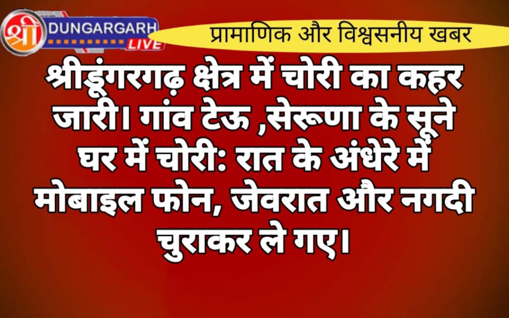 श्रीडूंगरगढ़ तहसील के गांव सेरुणा के एक घर में चोरी हो गई। चोर मोबाइल फोन, जेवरात और नगदी सहित काफी सामान उठाकर ले गए। घटना की जानकारी मिलने के बाद सेरुणा पुलिस ने छानबीन शुरू कर दी है।सेरुणा थाना क्षेत्र में आने वाले टेऊ गांव में जुगल किशोर स्वामी के घर पर चोरी हुई है। जुगल किशोर ने पुलिस को बताया कि रविवार को जब वो अपने घर पहुंचा तो सामान अस्त-व्यस्त था। घर से कीमती सामान चोरी किया गया है।चोर ने यहां रखा एक वीवो कंपनी का मोबाइल फोन, दो सोने की अंगूठी, तीस हजार रुपए नगद चोरी कर लिए। इसके अलावा भी काफी सामान चोरी हुआ है, जिसकी लिस्ट बनाकर पुलिस को सौंपी गई है। सेरुणा पुलिस ने मौके पर पहुंचकर छानबीन की है।मौका मुआयना करने के बाद मामला दर्ज किया है। मामले की जांच हेड कॉन्स्टेबल महेश कुमार को सौंपी गई है। बीएनएस की धारा 331 (4) व 305 (ए) के तहत मामला दर्ज किया गया है।श्रीडूंगरगढ़ के ग्रामीण क्षेत्रों में पिछले कुछ महीनों में चोरी की घटनाओं में बढ़ोतरी हुई है। श्रीडूंगरगढ़ और सेरुणा दोनों थाना क्षेत्रों में चोरी हो रही है। इसी क्षेत्र में मोटर साइकिल चोरी की घटनाएं भी लगातार बढ़ रही है। पिछले दिनों पुलिस ने मोटर साइकिल चोर गिरोह भी पकड़ा था लेकिन अब दूसरा गिरोह सक्रिय हो गया है।