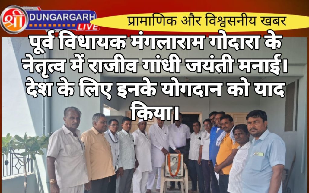 ‘भारत रत्न’ स्व. राजीव गांधी जी का योगदान भारत की प्रगति में अद्वितीय है। उन्होंने देश में कंप्यूटर और संचार क्रांति की नींव रखकर आधुनिक भारत की परिकल्पना को साकार किया, जिससे देश के विकास को नई दिशा मिली। युवाओं के प्रेरणास्रोत के रूप में उन्होंने तकनीकी और शिक्षा के क्षेत्र में जो सुधार किए, वे आज भी हमारे देश की समृद्धि और विकास के आधार हैं। उनकी जयंती के अवसर पर मैं उन्हें कोटि-कोटि नमन करता हूं। उनके राष्ट्र निर्माण में दिए गए योगदान को सदैव सम्मान और कृतज्ञता के साथ याद किया जाएगा। पूर्व विधायक मंगलाराम गोदारा के नेतृत्व में जयंती मनाई गई इस दौरान कमकीशोर नाई रमेश प्रजापत शिव प्रसाद नाई हीरालाल जाट रमेश बाशनीवाल,मनोज सुथार विमल नाई राजकुमार माली रमेश व्यास राजेश मंडा राजकुमार माली प्रकाश दुसाद अयुब दमामी, रामचन्द्र जाझुना राहुल वाल्मीकि आदि मौजूद रहे