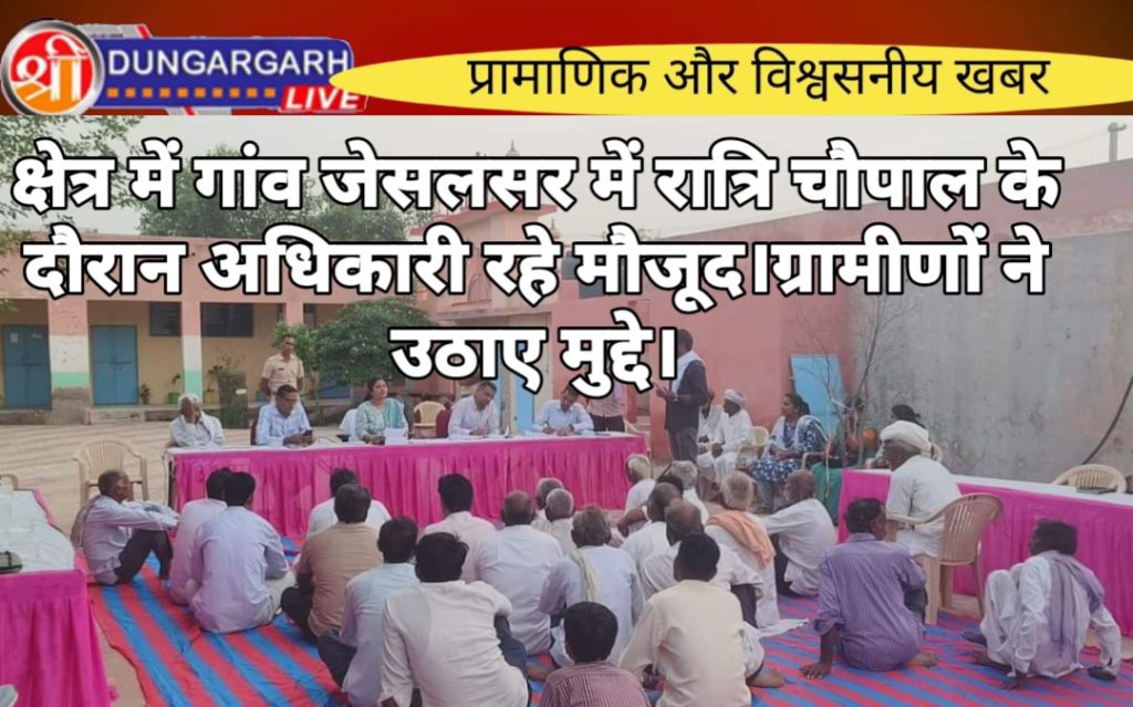 ग्राम पंचायत जैसलसर में पंचायत स्तरीय रात्री चौपाल और जनसुनवाई का आयोजन किया गया , जिसमें उपखंड अधिकारी उमा मित्तल, तहसीलदार राजवीर कड़वासरा, बीडीओ मनोज कुमार धायल ,सीबीओ ओमप्रकाश प्रजापत, सरपंच प्रतिनिधि भीखराज जाखड़,पटवारी रामचंद्र जी , ग्रामसेवक पिंकू प्रजापत,पशुजन सहायक सुमित पुनिया , एलडीसी अनिता मीना और अन्य सरकारी कर्मचारियों के साथ साथ गांव के प्रबुद्ध नागरिक गणों के साथ युवाओं की भागीदारी रही । इस दौरान अनेक ग्रामीणों ने मिलकर उपखंड अधिकारी के सामने गांव में व्याप्त पानी की कमी , सड़कों का बुरा हाल , सार्वजनिक स्थानों पर कचरे के ढेर,गांव से निकलने वाली 11 केवी लाइन को लोहे के टावरों में परिवर्तित, स्कूलों में सुविधाओं के विकास ,रेलवे हाल्ट की मांग ,गांव की कांकड़ में अतिरिक्त जीएसएस बनवाने की मांग ,गांव में खेल मैदान की स्वीकृति दिलाने ,सातलेरा में पीएचईडी के ट्रांसफार्मर से घरेलू कनेक्शनों को हटवाकर अलग ट्रांसफार्मर लगवाने की मांग , अभयसिंहपुरा में 11 केवी लाइन हटवाकर गांव से बाहर करने और गांव में एक अतिरिक्त ट्यूबवेल बनवाने की मांग और अन्य प्रकार की समस्याओं और मुद्दों को रखा गया उपखंड अधिकारी ने अपने कार्यक्षेत्र से होने वाले कामों को जल्द करवाने का आश्वासन दिया और बाकी कार्यों को संबंधित कार्यालयों में भेजकर मांग रखने की बात कही।शान्ति पूर्ण रात्रि चौपाल और जनसुनवाई का समापन हुआ ग्रामवासियों ने समस्त अधिकारियों का आभार वक्त किया ।।