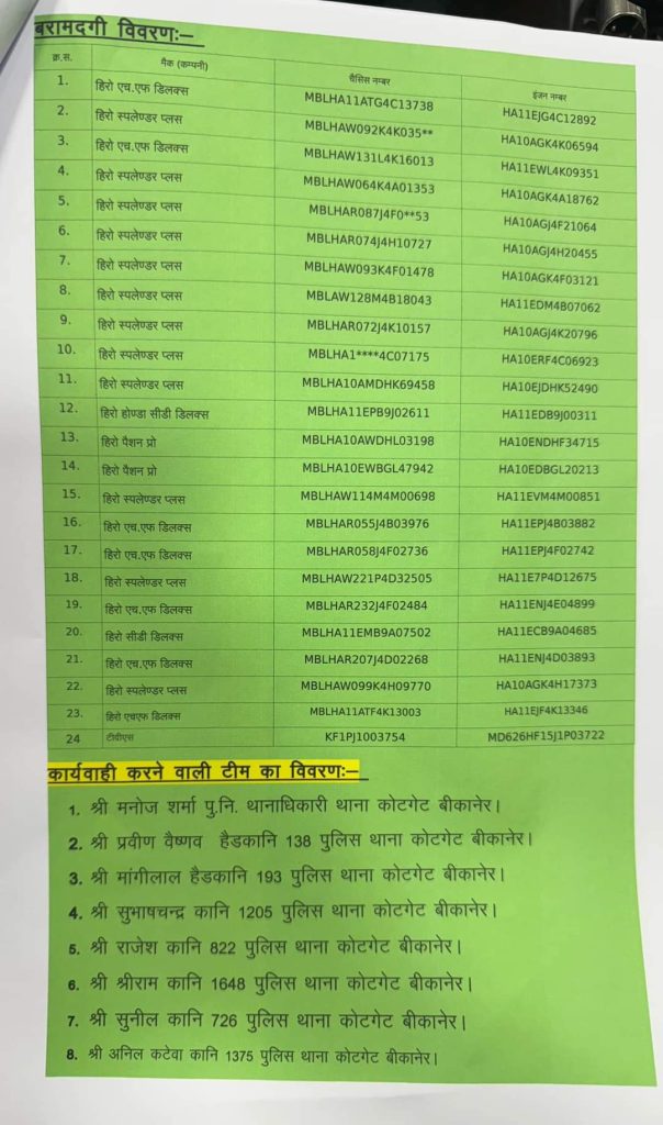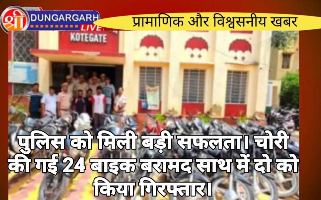 बाइक चोरी के मामले दिन पे दिन बढ़ते ही जा रहे है।ओर चोर इतने शातिर हो गए है की घर के बाहर खड़ी बाइक को चुराकर ले जा रहे है आज बीकानेर कोटगेट पुलिस को बड़ी सफलता मिली है चोरी हुई 24 बाइक के साथ दो चोर गिरफ्तार। बरामद बाइक की डिटेल सार्वजनिक की जा रही है, ताकि संबंधित मालिक वापस ले सकें।पुलिस ने बताया- पिछले दिनों चोरी हुई बाइक की पड़ताल करते हुए दो युवकों भंवरलाल और लक्ष्मण राम को गिरफ्तार किया गया। दोनों की निशानदेही पर अलग-अलग जगह से 24 बरामद बरामद की गई। पुलिस ने सभी बाइक की रिपोर्ट तैयार की है, जिसे सार्वजनिक किया जा रहा है। ये बाइक बीकानेर शहर में ही अलग-अलग जगहों से चोरी की गई थी।