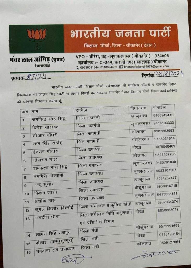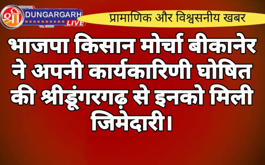 भाजपा देहात बीकानेर ने अपके संगठन का विस्तार करते हुए भाजपा देहात किसान मोर्चा की घोषणा की। किसान मोर्चा के देहात जिलाध्यक्ष भंवरलाल जांगिड़ ने बताया कि भारतीय जनता पार्टी किसान मोर्चा के प्रदेशाध्यक्ष भागीरथ चौधरी ने भाजपा देहात जिलाध्यक्ष जालमसिंह भाटी की अनुशंसा पर भाजपा देहात किसान मोर्चा की 24 पदाधिकारियों की कार्यकारिणी घोषित की। इस कार्यकारिणी में श्रीडूंगरगढ़ के रतनसिंह राठौड़,किशन जोशी,लक्ष्मण राजपूत और ममता मेगवाल सहित चार कार्यकर्ताओ को जिलामहामंत्री, लूणकरणसर से अशोक मारू सहित 7 भाजपा कार्यकर्ताओ को जिलाउपाध्यक्षघोषित किया गया। खाद्य एवं आपूर्ति मंत्री सुमित गोदारा, विधायक ताराचंद सारस्वत, विधायक जेठानन्द व्यास, विधायक डॉ विश्वनाथ मेघवाल, विधायक सुश्री सिद्धि कुमारी, बिहारीलाल बिश्नोई सहित भाजपा नेताओं ने सभी पदाधिकारियों को शुभकामनाएं दी।