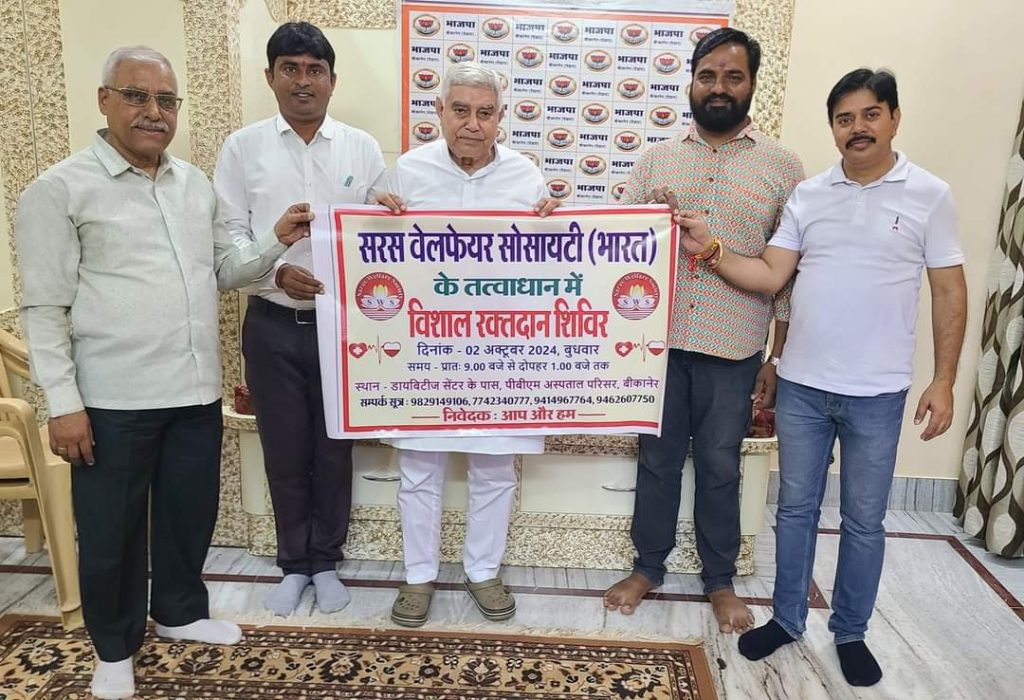विधायक ताराचंद सारस्वत ने बीकानेर स्थित निज निवास पर सरस वेलफेयर सोसायटी (भारत) के तत्वाधान में 2 अक्टूबर को आयोजित विशाल रक्तदान शिविर के पोस्टर का विमोचन किया!विधायक ताराचंद सारस्वत ने बताया की रक्तदान एक बहुत बड़ा दान है इसमें बढ़ चढ़कर अपनी भागीदारी निभानी चाहिए रक्त को दुनिया की किसी भी फैक्ट्री या मशीन से नहीं बनाया जा सकता यह केवल मानव के शरीर में ही बनता है आपका दिया हुआ रक्तदान किसी व्यक्ति की जान बचा सकता हैं इसलिए इस पुनीत कार्य में ज्यादा से ज्यादा संख्या में भाग लेने की अपील की। विशाल रक्तदान शिविर सरस वेलफेयर सोसायटी के तत्वाधान में दिनाक 2 अक्टूबर 2024 बुधवार स्थान डायबिटीज सेंटर के पास पीबीएम अस्पताल परिसर बीकानेर।