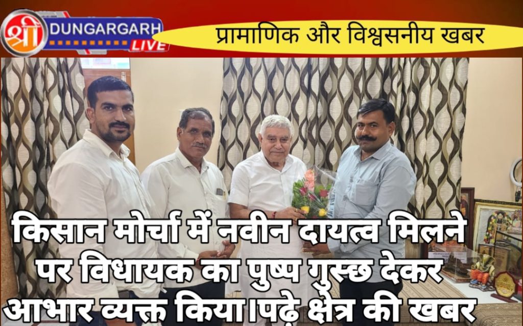 आज नवनियुक्त जिलामहा मंत्री भाजपा किसान मोर्चा बीकानेर देहात रतनसिंह राठौड़ केउ एवं जिला उपाध्यक्ष किशन जोशी ने किसान मोर्चा में नवीन दायित्व दिए जाने पर विधायक ताराचंद सारस्वत के बीकानेर स्थित निज निवास पर पहुंचकर पुष्प गुस्छ भेंट कर विधायक सारस्वत का आभार व्यक्त किया। इस दौरान अशोक सिंह सोनियासर ,शिवदानसिंह ,रजनीकांत सारस्वत भगवान सिंह तंवर उपस्थित रहे।