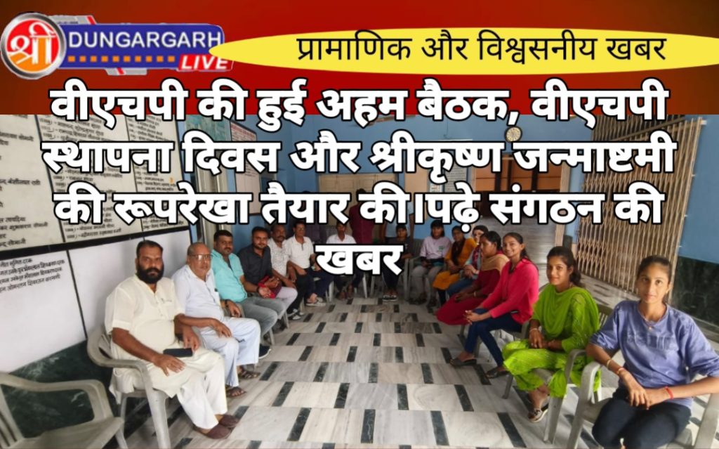 विश्व हिंदू परिषद की स्थापना दिवस और श्रीकृष्ण जन्माष्टमी के उपलक्ष्य पर वीएचपी नगर,मातृशक्ति,दुर्गावाहिनी की अहम बैठक महेश्वरी भवन आडसर बास में संपन हुई।कार्यकर्म की रूपरेखा तैयार की।प्रखंड अध्यक्ष श्याम सुंदर जोशी ने सभी कार्यकर्ताओं को अपनी अपनी जिम्मेदारी सौंपी नगर अध्यक्ष लालसिंह ने कार्यक्रम की रूपरेखा बनाई जिसमें सबसे पहले गणेश वंदना , बाल कृष्ण राधा प्रतियोगिता ,सभी स्कूलों के सांस्कृतिक नृत्य प्रतियोगिता ,भटकी फोड़ कार्यक्रम, अंत मे प्रसाद वितरण कार्यक्रम का समापन होगा,पखण्ड मंत्री दीपक सेठिया ने बताया सभी माताएं अपने घर से बालकृष्ण -राधा तैयार कर के लाये व प्रतियोगिता में भाग लेने सभी बच्चो को सान्त्वना पुरस्कार दिया जाएगा प्रोग्राम सांय 7.30 बजे प्रारंभ होगा।मिटिंग में सरक्षक भंवर दुगड़ ,स्याम सुंदर जोशी, लालसिंह राजपूत, अशोक नाई, भीखाराम सुथार, फतेह सिंह जांगिड़, त्रिलोक प्रजापत, अशोक बेद, दीपक सेठिया, मुकेश प्रजापत,पूरनमल स्वामी दुर्गावाहिनी में लक्ष्मी सुथार, देवकी तिवाड़ी, कुसुम प्रजापत, सिया सेन, अंकिता सेन, प्रज्ञा पुगलिया, सुशीला शर्मा, यशोदा शर्मा उपस्थित रहे।