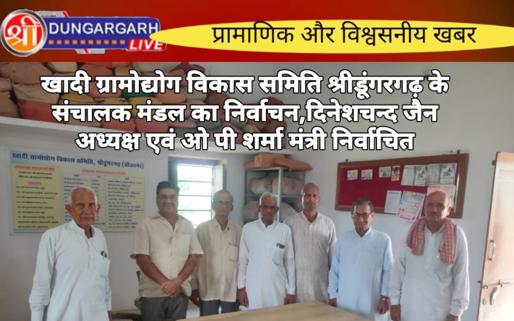 खादी ग्रामोद्योग विकास समिति श्रीडूंगरगढ़ के संचालक मंडल का 2024 – 25 का निर्वाचन खादी समिति कार्यालय श्रीडूंगरगढ़ में हुआ । नवीन निर्वाचन में अध्यक्ष पद पर रिटायर्ड आई ए एस दिनेशचन्द जैन, मंत्री ओमप्रकाश शर्मा, उपाध्यक्ष जैसाराम मेघवाल, सह मंत्री मांगीलाल मेघवाल पदाधिकारी निर्वाचित हुए । इसके साथ सदस्य के रुप मे साहित्यकार श्याम महर्षि, रिछपाल किरोड़ीवाल झुंझुनू, कमल किशोर शर्मा कोटा, कमल नयन महेंद्रा श्रीगंगानगर, राजस्थान खादी ग्रामोद्योग संस्था संघ जयपुर के मंत्री अनिल कुमार शर्मा , रामकिशोर लाम्बा आलमसिंह नेगी नोखा उपस्थित रहे । इस अवसर पर निर्वाचित अध्यक्ष दिनेशचन्द जैन ने कहा कि खादी ग्रामोद्योग विकास समिति श्रीडूंगरगढ़ आमजन को उच्च गुणवत्ता की वस्तुएं उपलब्ध करवाने के लिए प्रतिबद्ध है । संस्था के मंत्री ओ पी शर्मा ने संस्था की गतिविधियों की जानकारी देते हुए प्रगति प्रतिवेदन प्रस्तुत किया । जिसका सर्व सम्मति से अनुमोदन किया गया ।