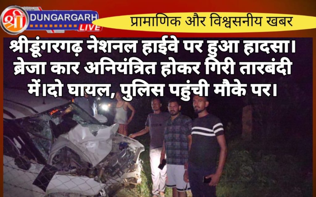 श्रीडूंगरगढ़ क्षेत्र में हादसे रुकने का नाम ही नही ले रहे है अभी अभी हुआ हादसा ,लगातार सड़क दुर्घटनाओं का ग्राफ बढ़ता जा रहा है नेशनल हाईवे 11पर हुऐ हादसे में दो लोग घायल हो गए मिली जानकारी के अनुसार बिग्गा गांव के पास तेज़ रफ्तार ब्रेजा कार अनियंत्रित होकर तारबंदी तोड़कर खेत में जा गिरी इस दुर्घटना में दो लोग घायल हो गए। जानकारी मिलने पर बिग्गा सरपंच जसबीर सारण सामाजिक कार्यकर्ता संतोष ओझा, थानाराम चौहान, बल्लुराम, महेंद्र ओझा, भेरू ओझा, सहित बड़ी संख्या में ग्रामीण मौके पर पहुंचे और घायलों को सेवा समिति की एंबुलेंस से उप जिला अस्पताल भेजा गया जहां दोनों की हालत गंभीर होने पर प्राथमिक उपचार करने के बाद 108 एंबुलेंस से पीबीएम ट्रॉमा सेंटर भेजा गया घटना की जानकारी मिलने पर श्रीडूंगरगढ़ पुलिस के एएसआई रविंदर सिंह मौके पर पहुंचे और क्रेन की सहायता से दुर्घटनाग्रस्त कार को मौके से हटाकर थाने ले जाया गया।