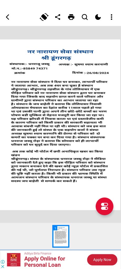 संस्था के संस्थापक धनराज जस्सू रोड़ा ने मीडिया को जानकारी देते हुए कहा कि इस पीड़ित परिवार को सरपंच के सहयोगसे मकान बनाकर देने की खबर कोई न्यूज़ पोर्टल में प्रकाशित की गई थी, जो पूर्णतया निराधार है। संस्थान परिवार उस न्यूज़ की पुष्टि नहीं करता है। दो दिन पूर्व स्थानीय पोर्टल पर लगी थी न्यूज जिसमे ये बताया गया था की सरपंच और सेवा संस्थान के सहयोग से गरीब परिवार को 170000 हजार रुपए लगाकर पका आशियाना शनिवार को सुपुर्द कर दिया गया है जबकि नर नारायण सेवा संस्थान के सस्थापाक धनराज जस्सू ने बताया की शनिवार को मकान कंप्लीट हुआ है और सोमवार को सेवा समिति द्वारा गरीब परिवार को आशियाना सुपुर्द करेगे।