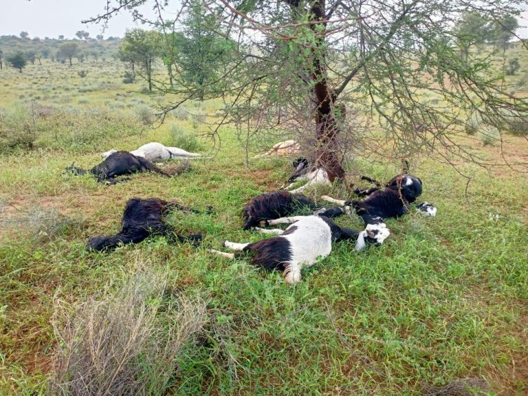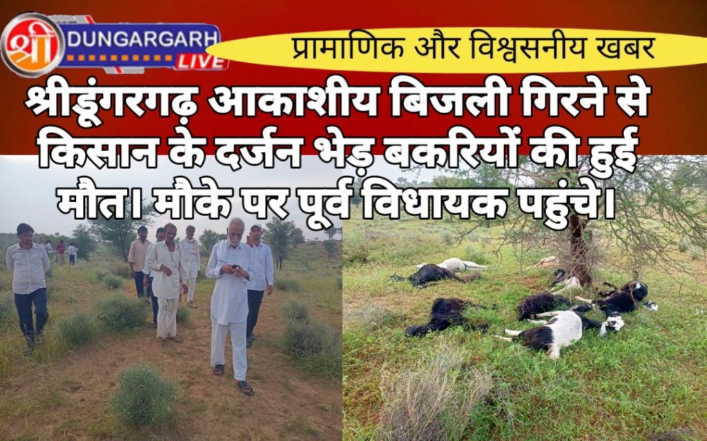 क्षेत्र में लगातार बारिश से आज जैतासर की रोही में आकाशीय बिजली गिरने से एक दर्जन भेड़ बकरियो की मौत हो गई, ओर 5 घायल हुई है,जिसमे तीन किसानों की भेड़ बकरियां थी। सुचना मिलने पर किसान नेता पूर्व विधायक कॉमरेड गिरधारी लाल महिया मौके पर पहुंचे और स्थानीय प्रशासन से वार्तालाप कर भेड़ बकरियां के मालिक तीनों किसानो रामेश्वर खिलेरी, शंकर गोदारा, पीथाराम नायक गुसाईसर बड़ा को मुवावजा दिलवाने के लिए संबंधित अधिकारियों को मौका रिपोर्ट दर्ज करने के निर्देश दिए।इस दौरान स्थानीय पुलिस स्थानीय पुलिस वेटरनरी डॉक्टर टीम, पटवारी सहित स्थानीय प्रशासन,अखिल भारतीय किसान सभा के हनुमान कूकना, मुकेश ज्याणी, मुखराम नायक,सरपंच प्रतिनिधि सहीराम नायक, मनीराम खिलेरी, कानाराम खिलेरी सहित अनेक ग्रामीण उपस्थित मौके पर मौजूद रहे।